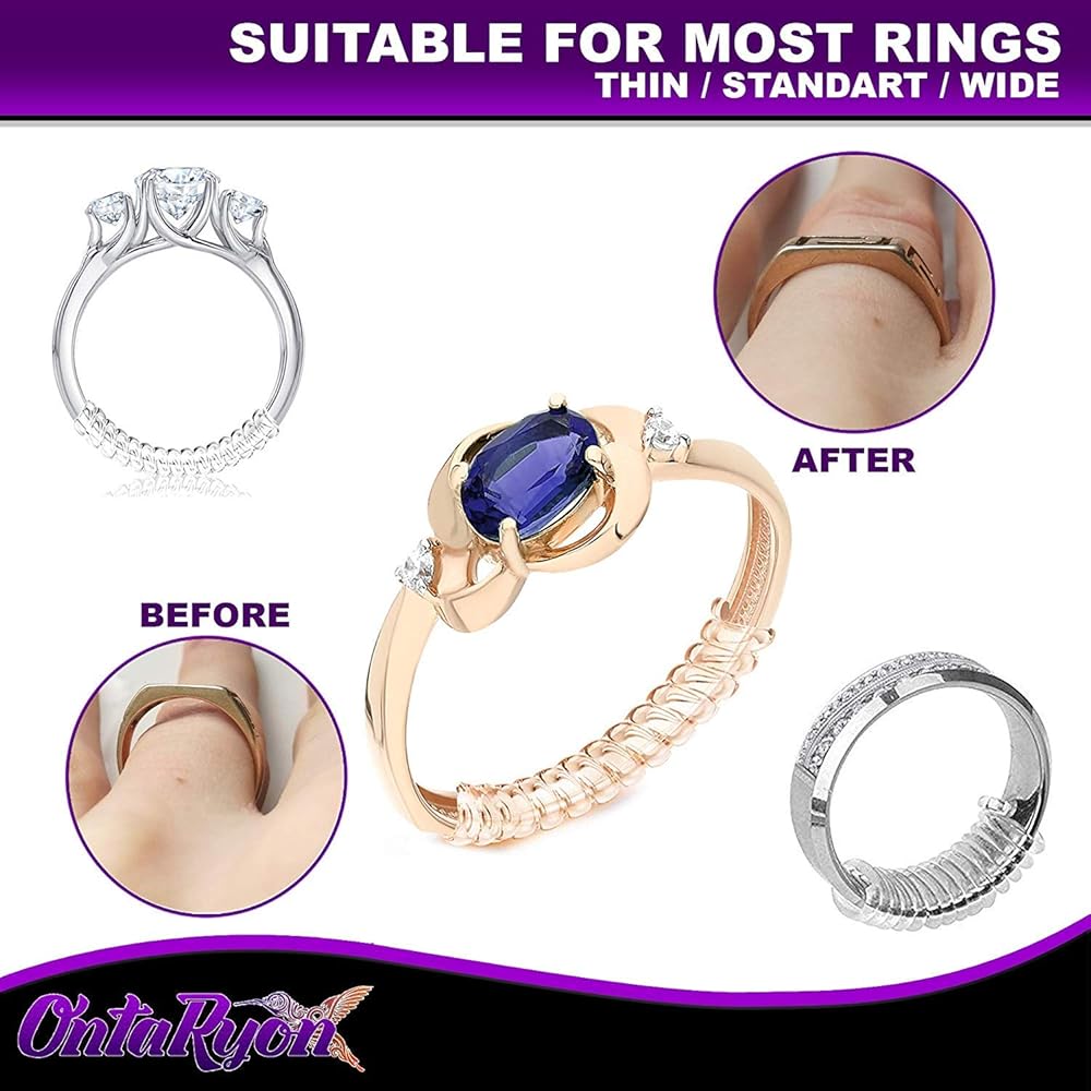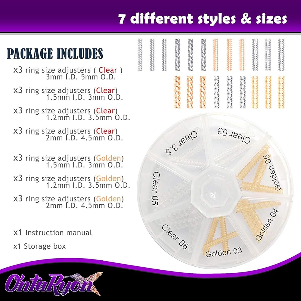 أداة ضبط حجم الخاتم المتنوعة من Ontaryon للخواتم الفضفاضة - مخفض لجعل الحلقة أصغر - أداة تغيير حجم حماية المشبك غير المرئي - عبوة مكونة من 21 قطعة، 7 أنماط - مقاسات ذهبية وواضحة - مثالية للفضة والذهب