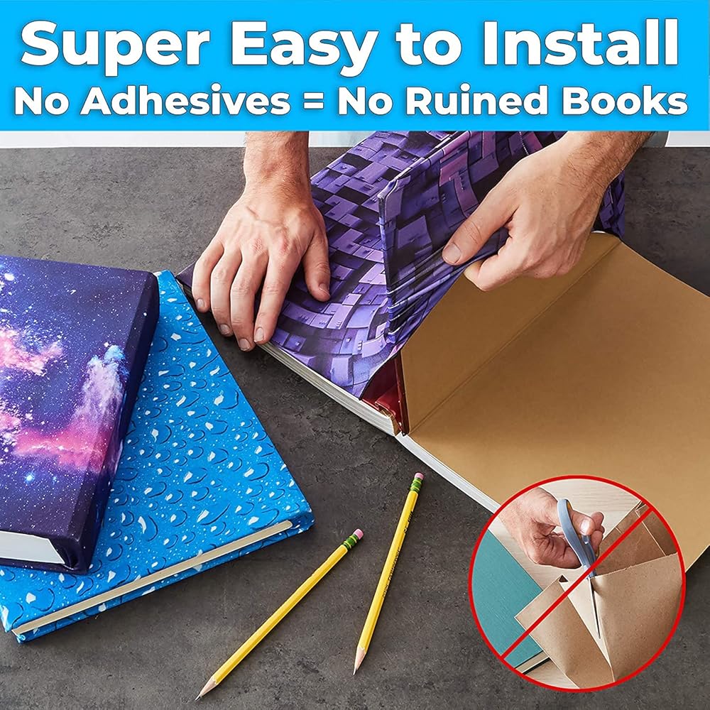 • SUPER EASY TO INSTALL - WITHOUT RUINING TEXTBOOKS. Simply stretch our book protectors over the cover of your hardback book, and you're ready to take on the school year! No taping or gluing required - so you can reuse it year after year.
