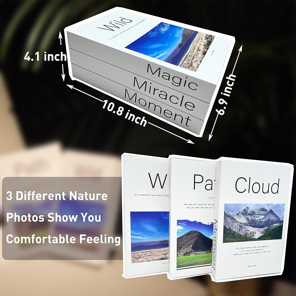 【محتويات العلبة】3 قطع من الكتب المزخرفة بمناظر طبيعية مختلفة، ويبلغ حجم المجموعة الكاملة 9.4 بوصة × 6.3 بوصة × 3.5 بوصة. هناك مناظر طبيعية جميلة في غلاف كل كتاب، يمكنك الاستمتاع بالبحيرة النقية والبرية الخضراء والثلج. الجبل عليهم.
