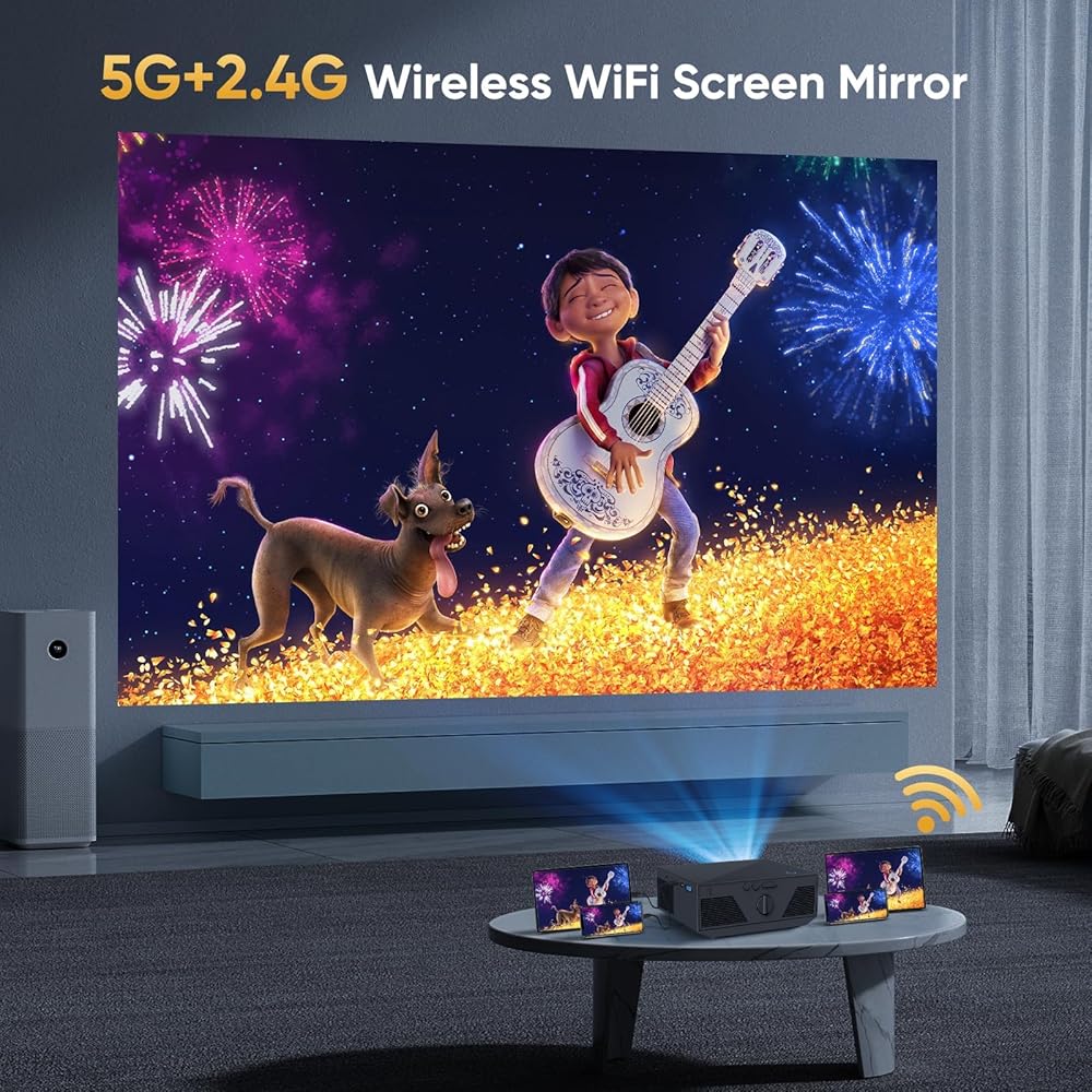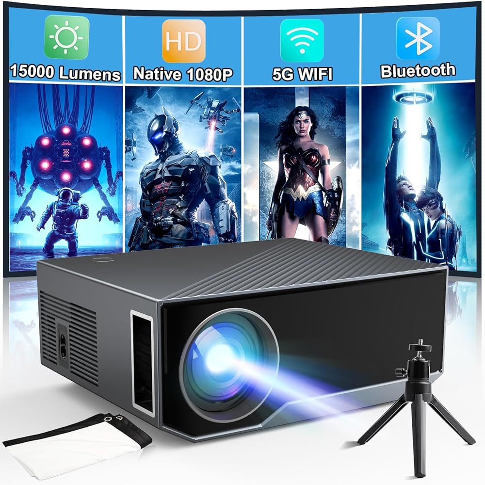 جهاز عرض مزود بواي فاي وبلوتوث، جهاز عرض صغير أصلي 1080 بكسل 15000 لومن 500 ANSI 4K، جهاز عرض فيديو محمول متوافق مع عصا تلفاز Iphone Android Phone (يتضمن حامل ثلاثي القوائم وشاشة)