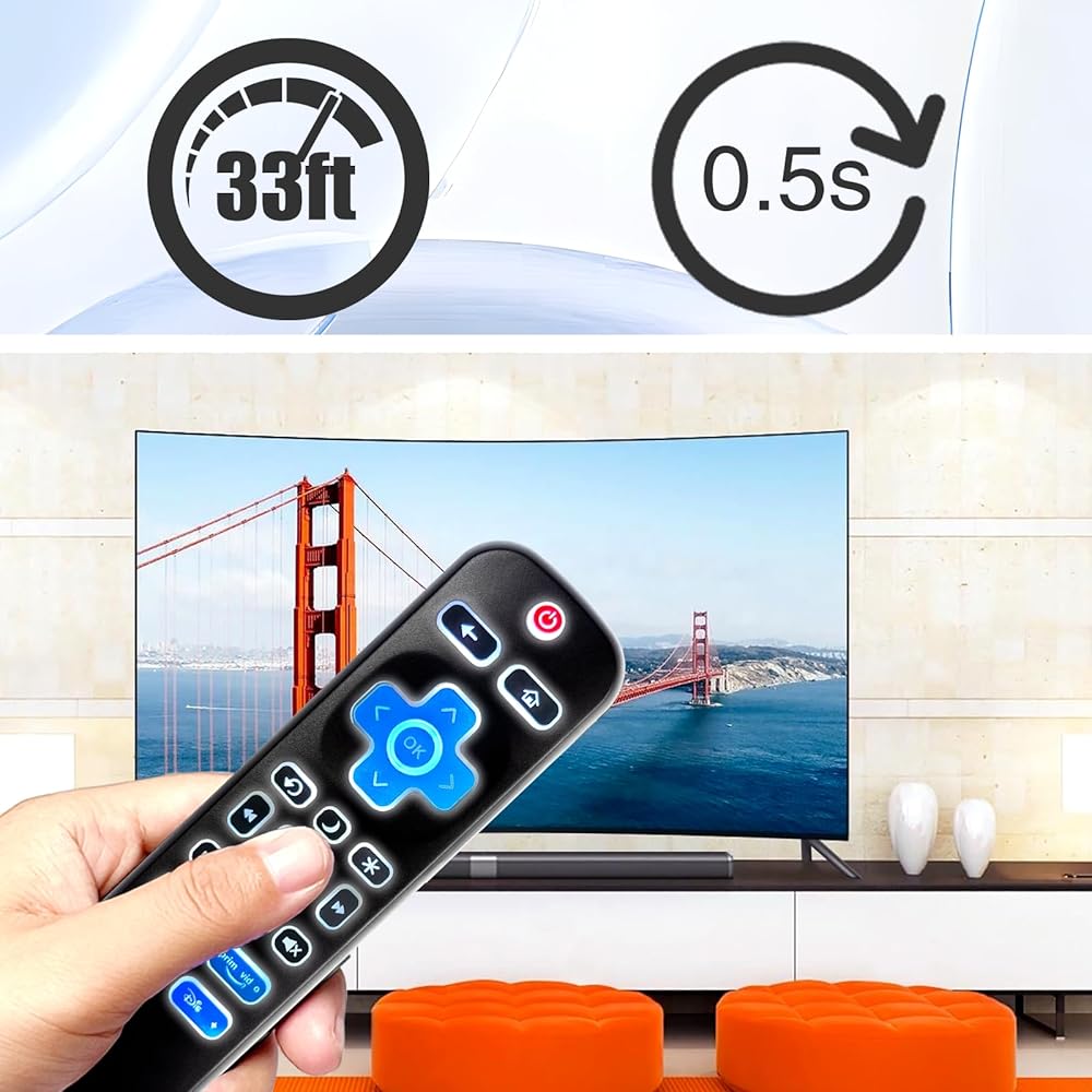 【وظيفة إضاءة خلفية فريدة من نوعها】من السهل العثور على جهاز التحكم عن بعد لتلفزيون Roku في الليل الداكن. فقط اضغط على أي زر، وسيتم تشغيل الإضاءة الخلفية لمدة 5 ثوانٍ، وسيتم إيقاف تشغيلها تلقائيًا.