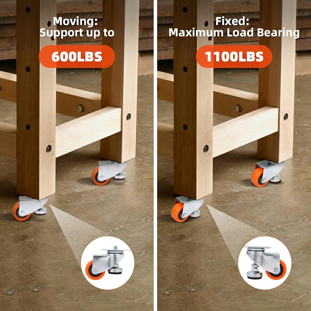 👍عجلات تسوية شديدة التحمل: تتميز عجلات طاولة العمل شديدة التحمل ببنية من الفولاذ الممتاز ومحمل كروي مما يوفر القوة الصناعية والمتانة، وتتميز عجلات آلة التسوية هذه بقدرة تحمل تصل إلى 1000 رطل كمجموعة من 4، عندما تنخفض قدم التسوية إلى نفس الارتفاع من العجلة، يمكنها دعم ما يصل إلى 1800 رطل.
