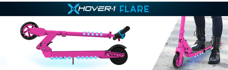 سكوتر إلكتروني آمن وممتع للأطفال - يتميز سكوتر Hover-1 Flare الكهربائي بمحرك بدون فرش بقدرة 120 وات مع عزم دوران كافٍ للوصول بسهولة إلى المنحدرات التي تصل إلى 5 درجات، مع إطارات عالية القبضة مقاس 6 بوصات أمامية و5.5 بوصات خلفية توفر قيادة سلسة ومريحة