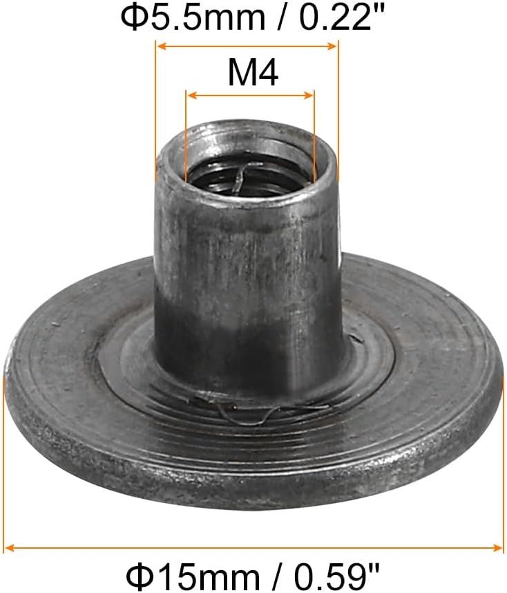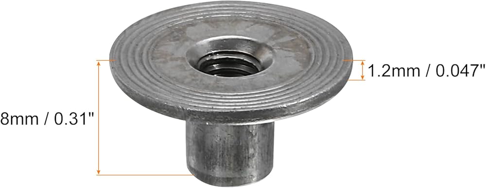قطر الخيط الأنثوي: M5؛ الملعب: 0.8 مم؛ قطر القاعدة المستديرة: 15 ملم / 0.59 بوصة؛ سمك القاعدة المستديرة: 1.3 ملم / 0.051 بوصة؛ الارتفاع الإجمالي: 8 مم / 0.31 بوصة؛ قطر فتحة الحفر (قطر قضيب الجوز): 6.5 مم / 0.26 بوصة؛ محتوى العبوة: 24 قطعة × صواميل تي شيرت