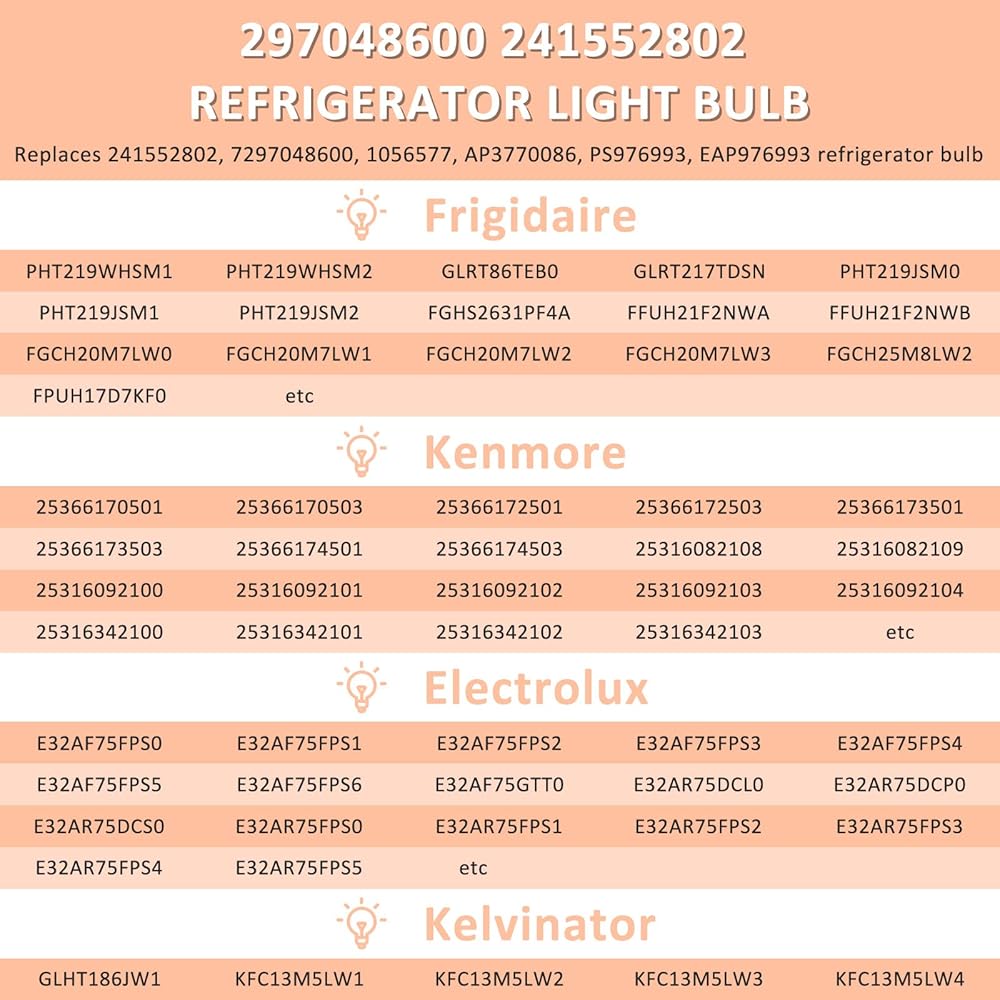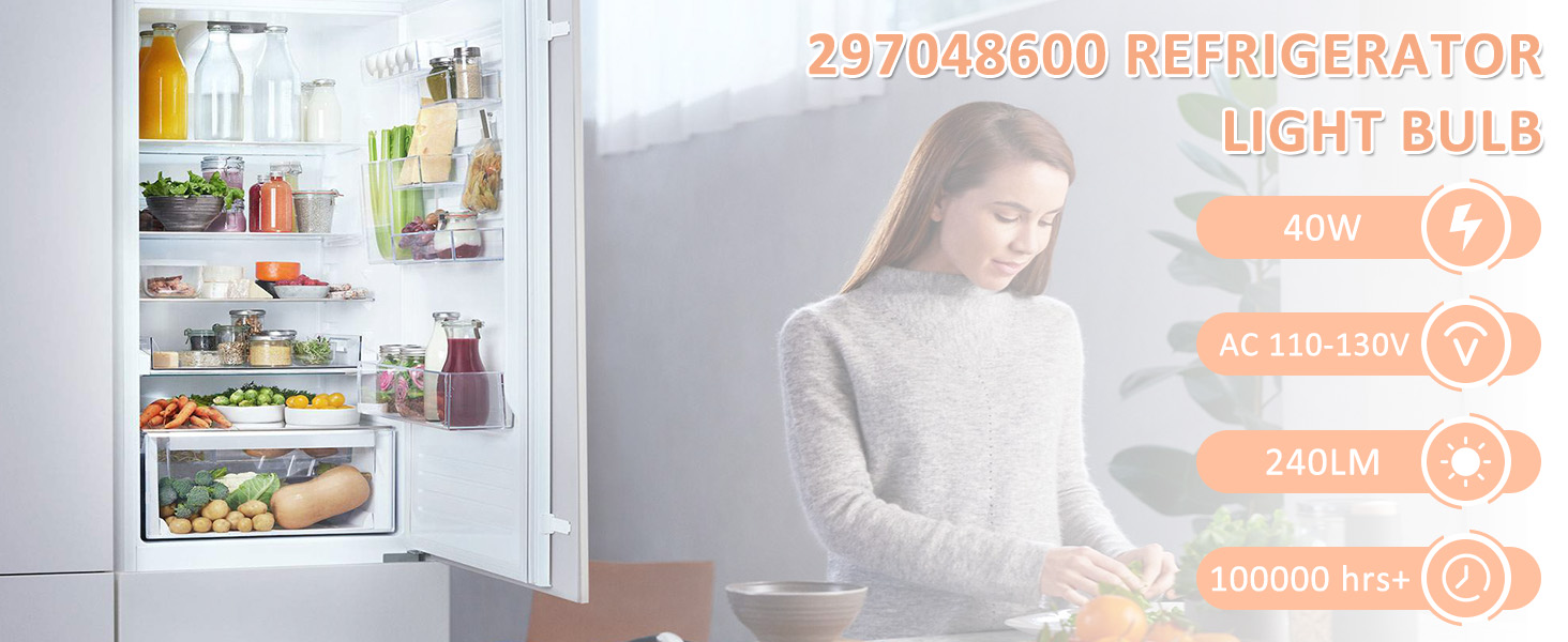 نماذج متوافقة - المصباح الكهربائي 297048600 241552802 ينطبق على العلامة التجارية المعروفة Ken-أكثر من 490 طرازًا، Frigi-daire أكثر من 590 طرازًا، كما يناسب ثلاجة Elec-trolux، وCro-sley، وGib-son، وKelvi-nator أو الفريزر. إذا لم تكن متأكدًا مما إذا كانت ثلاجتك مناسبة أم لا، فيمكنك مراسلتنا عبر البريد الإلكتروني وسنرد عليك في غضون 12 ساعة.