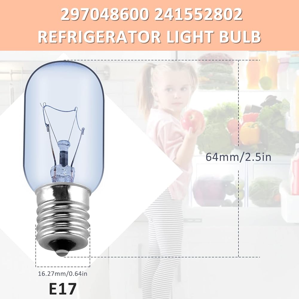 مواصفات المصباح الكهربائي - المصباح الكهربائي 297048600 241552802 يضيء الجزء الداخلي من الثلاجة لمعظم ثلاجة Frigi-daire وKen-more وElec-trolux. T8، 110-130 فولت، 40 وات، E17. يحل ضوء الثلاجة محل 7297048600، 1056577، AP3770086، PS976993، EAP976993