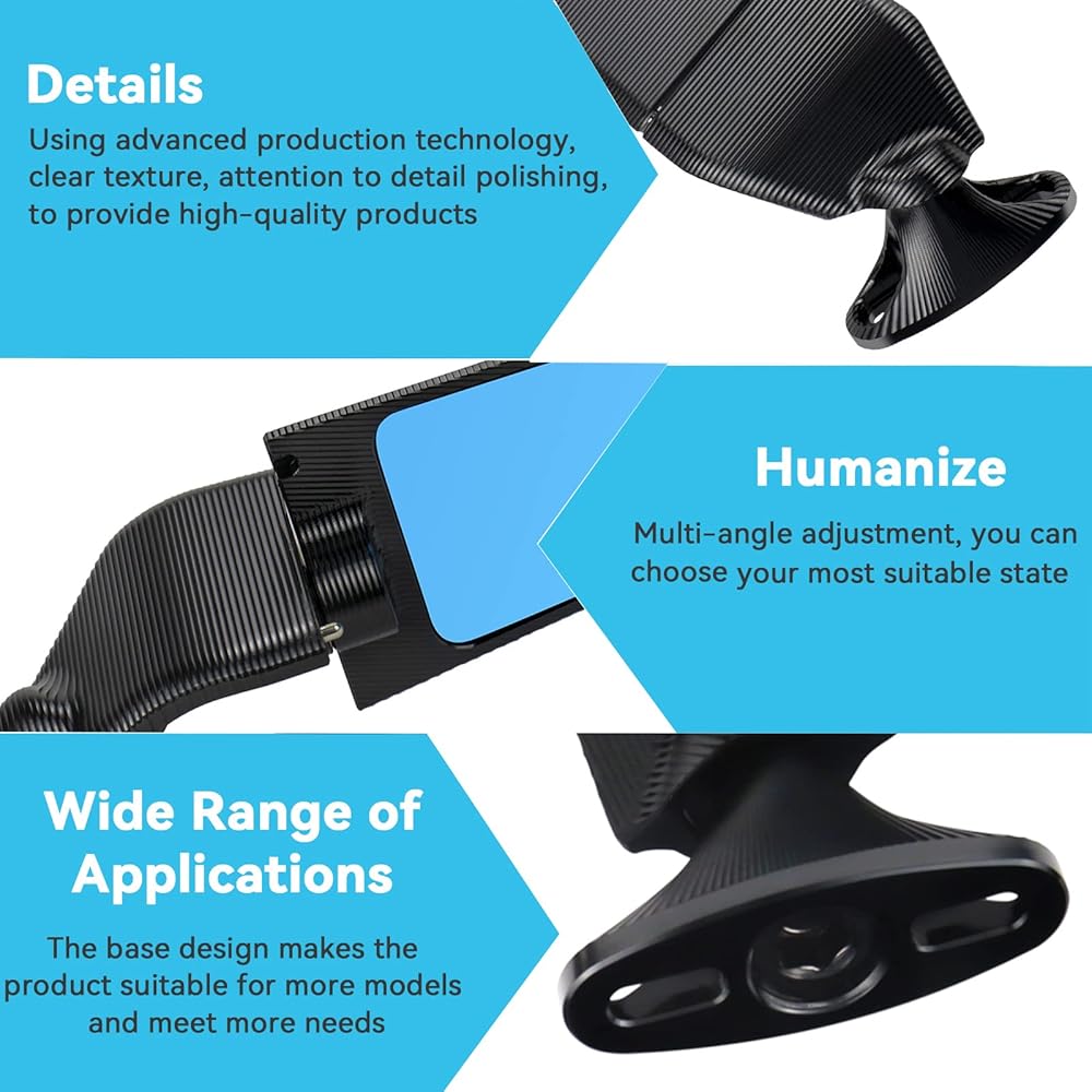 • التصميم: ملحق مصمم خصيصًا للدراجات الرياضية الفائقة. يتكون من جزء ثابت، والذي يسمح بالتركيب مباشرة على الهدية، وجزء متحرك، يعمل كحامل زجاج المرآة. بفضل نظام دوار، وبحركة بسيطة، يتم محاذاة الجزأين: في الوضع المغلق، تصبح المرآة عبارة عن رقاقة ديناميكية هوائية.