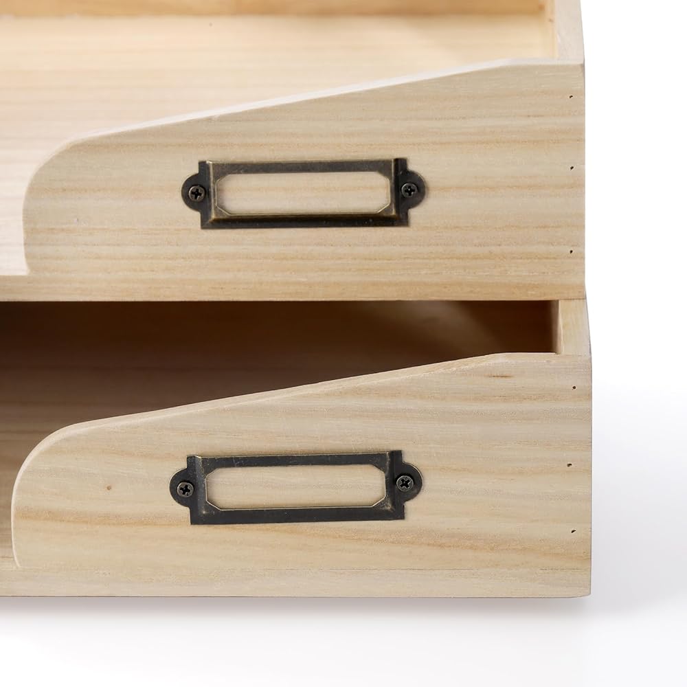 Fasmov 2 علبة خشبية بحجم الحروف، صينية مكتب منظم رسائل مكتب قابلة للتكديس، منظم صينية الورق لتنظيم سطح المكتب مع حامل بطاقة تسمية معدنية، حامل مجلد ملفات سطح المكتب الخشبي