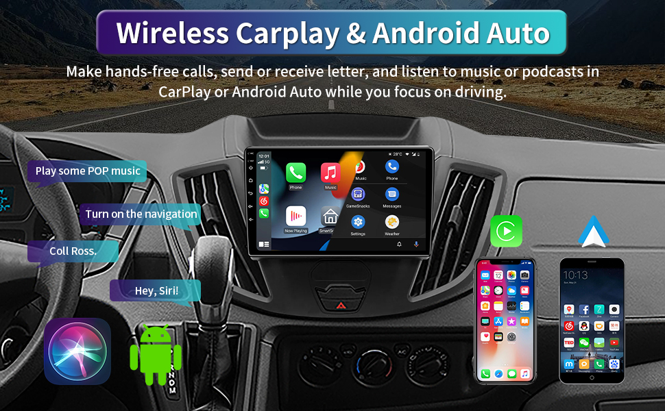 【Carplay اللاسلكي وAndroid Auto اللاسلكي】استمتع بـ CarPlay اللاسلكي وAndroid Auto السلكي/اللاسلكي مع Bluetooth 5.0 للاتصال السريع والسهل. ما عليك سوى التحدث إلى Siri/Hey Google أو لمس الشاشة للحصول على الاتجاهات من خريطة هاتفك، وإجراء المكالمات، والاستماع إلى رسائل البريد الصوتي، وإرسال واستقبال الرسائل النصية، والاستماع إلى الموسيقى المفضلة لديك، كل ذلك مع الحفاظ على تركيزك على الطريق.