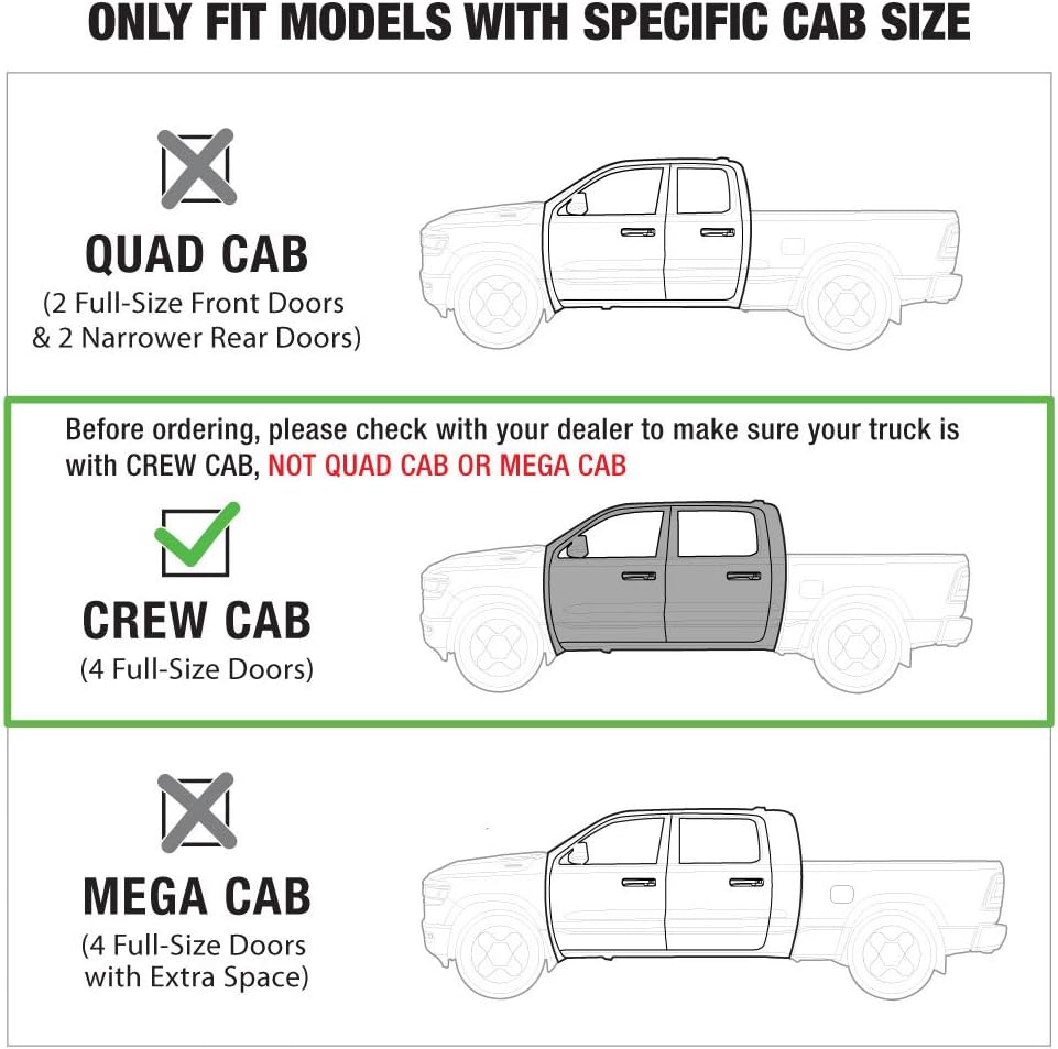 Cab Size Note: Only fit Crew Cab with 4 full-size doors. Not for Quad Cab or Mega Cab. (See Image for more info)