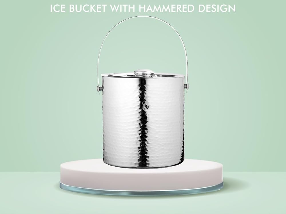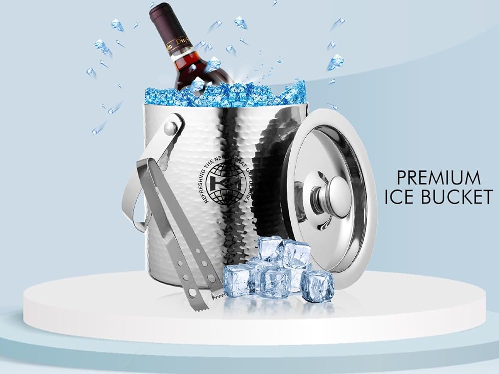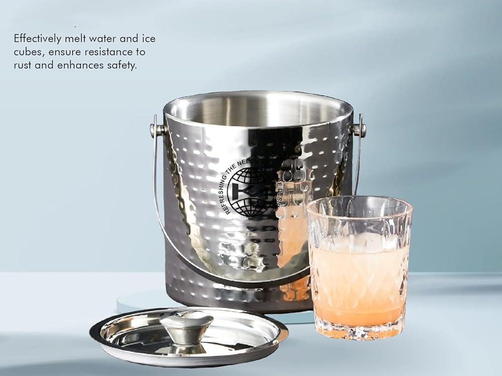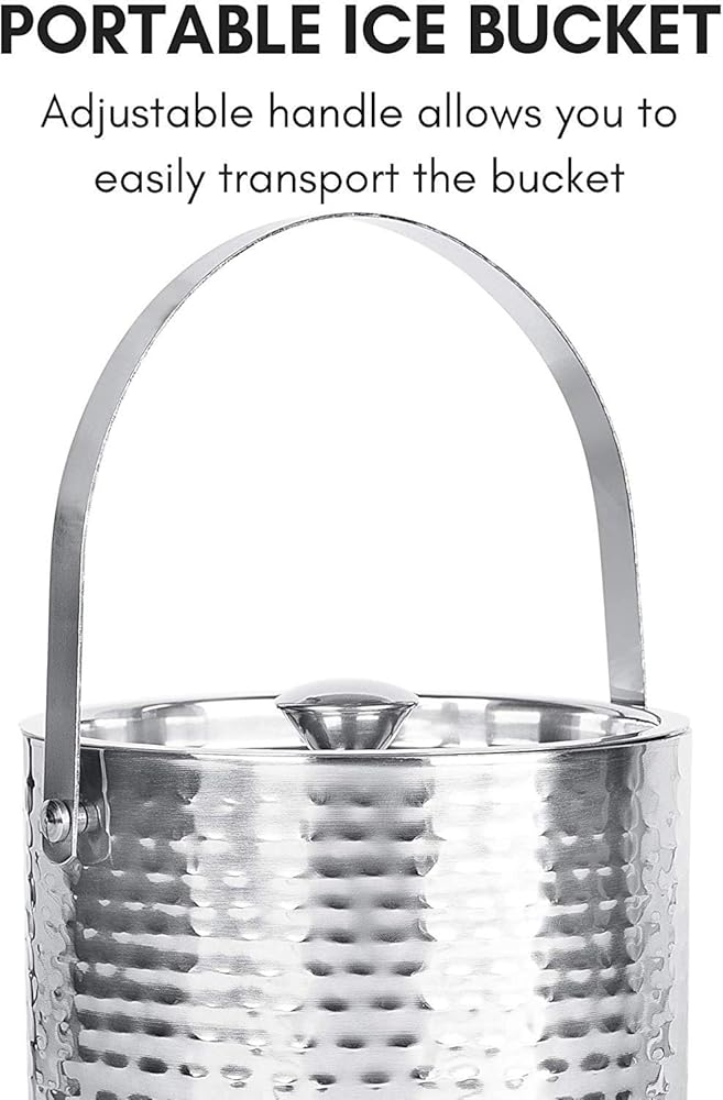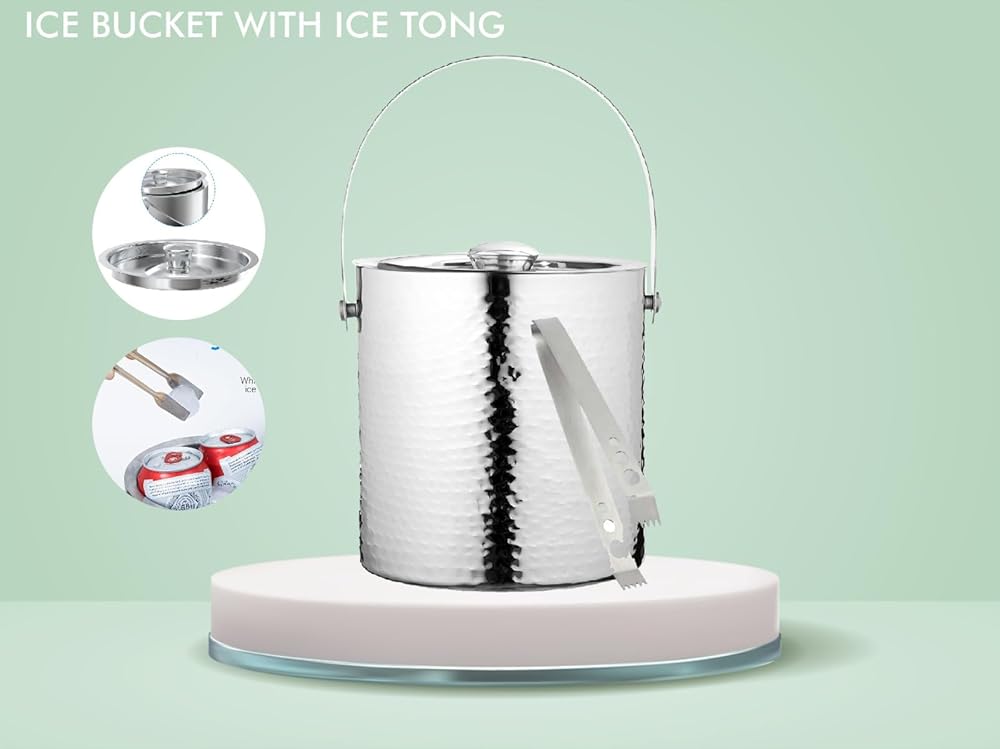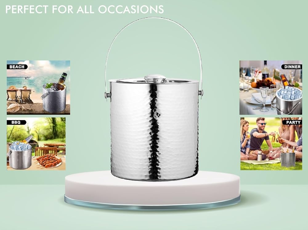 جودة الدلو المعدني - مصنوع من الفولاذ المقاوم للصدأ عالي الجودة لذلك سيدوم مدى الحياة مع تركيبات ذات جودة ممتازة لن تسقط. هيكل مزدوج الجدار يحافظ على البرودة في الداخل ويمنع التكثيف الخارجي. يستمر الثلج لأكثر من 6 ساعات. مصنوع من الفولاذ المقاوم للصدأ المصقول والمقاوم للتلطخ، ويتميز دلو الثلج بمظهر أنيق وعصري لترقية مناسبتك. لا يوجد أي من السموم الضارة الموجودة في البلاستيك لهذا الدلو المقاوم للصدأ تمامًا.
