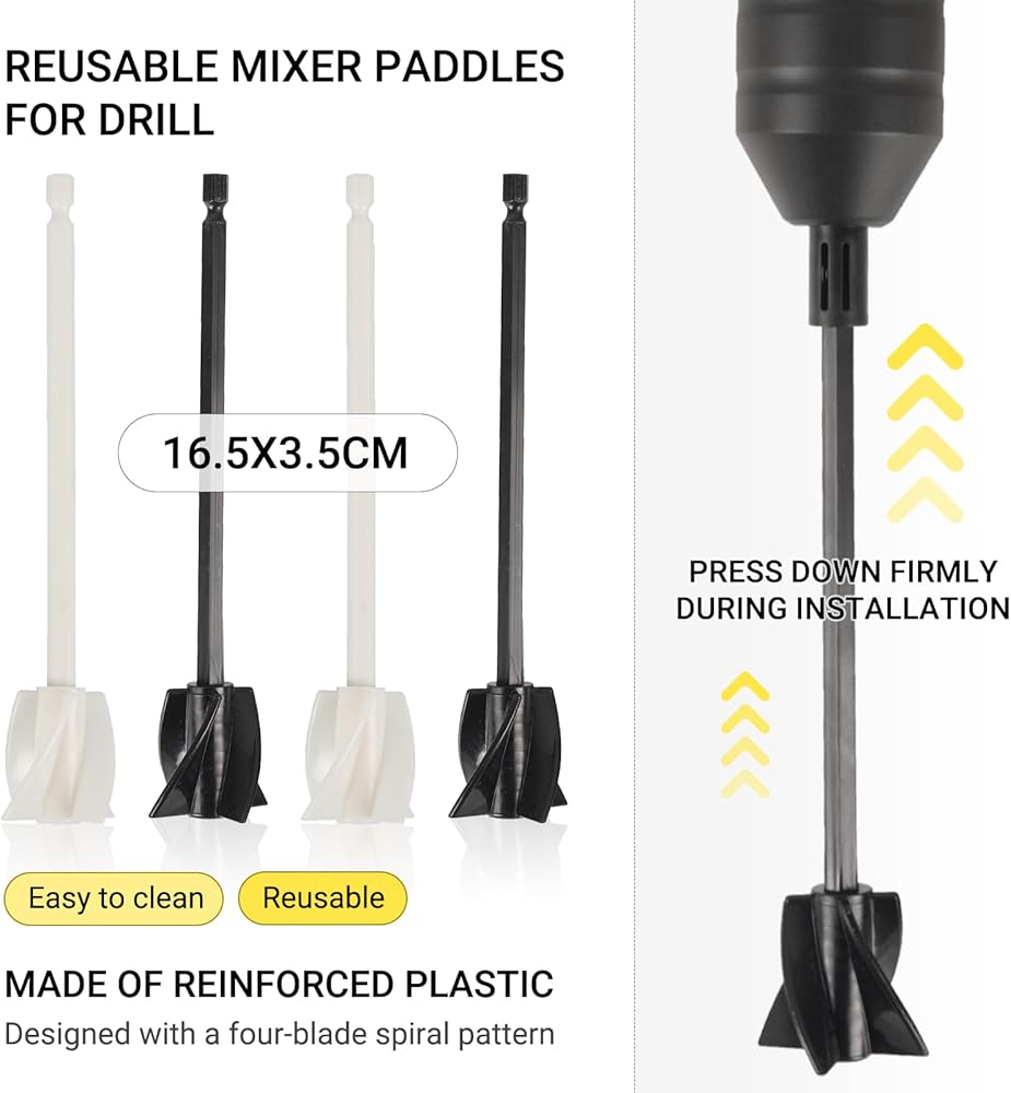 • وسادات خلط قابلة لإعادة الاستخدام للحفر: تتضمن المجموعة 4 مجاذيف خلاط إيبوكسي متينة مصنوعة من البلاستيك المقوى. هذه المجاذيف ليست سهلة التنظيف فحسب، بل قابلة لإعادة الاستخدام أيضًا. تم تصميمها بنمط حلزوني رباعي الشفرات، ويمكن ربطها بسهولة بالمثقاب الخاص بك، مما يضمن خلطًا شاملاً ومتساويًا مع تقليل دمج الفقاعات.
