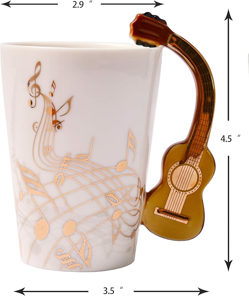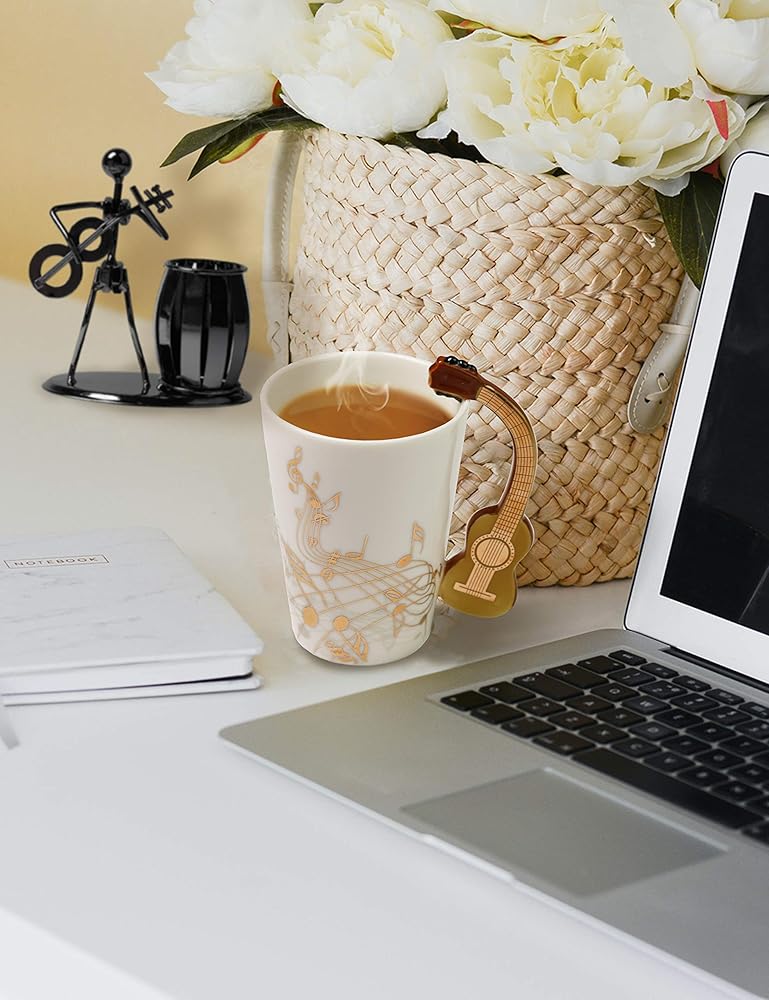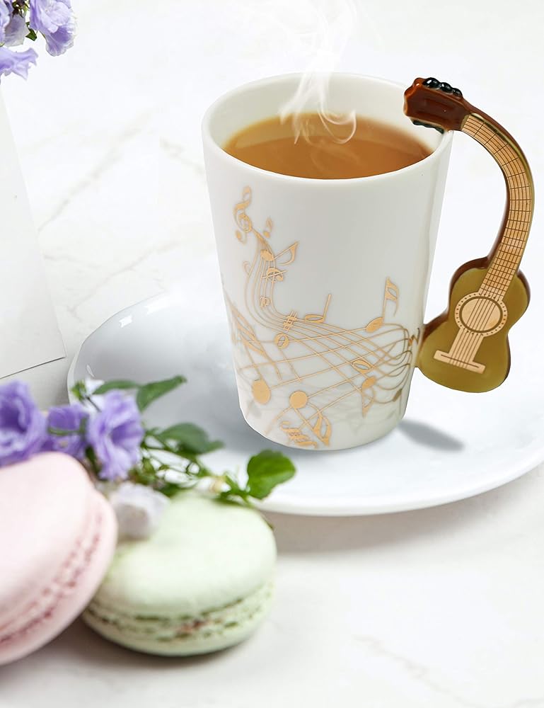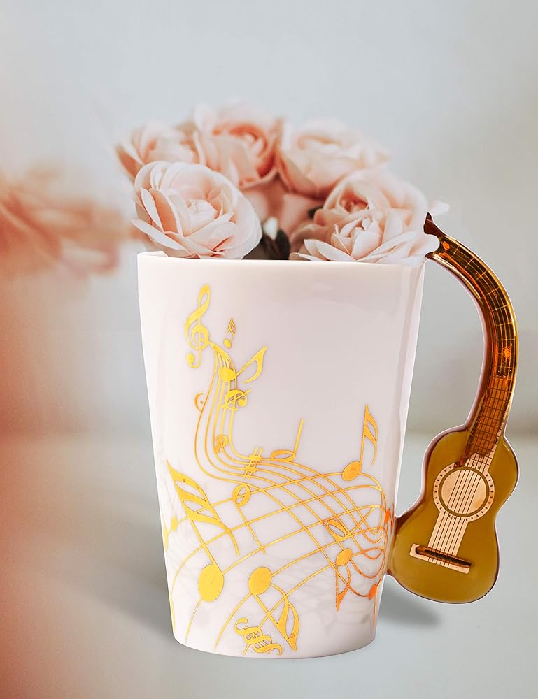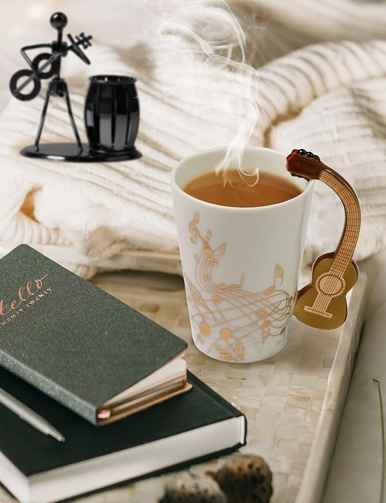 هدايا الجيتار: تشتمل هدايا معلم الجيتار هذه على كوب جيتار سيراميكي مطبوع عليه ملاحظات موسيقية ويمكن استخدامها أيضًا كهدية للاعبي الجيتار أو ديكور الجيتار. وتأتي مجموعة هدايا الجيتار أيضًا مع حامل قلم جيتار للمكتب، وهي بالتأكيد أفضل هدايا أكواب الجيتار للفتيات أو هدايا الجيتار لمحبي الموسيقى.