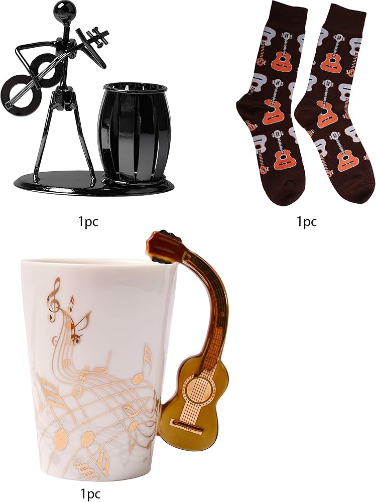 هدايا للاعبي الجيتار: تشتمل مجموعة كوب الجيتار الموسيقية الخاصة بنا أيضًا على حامل قلم جيتار واحد للمكتب، وجوارب جيتار واحدة للحفاظ على دفء قدمك كهدايا مدرس الجيتار.