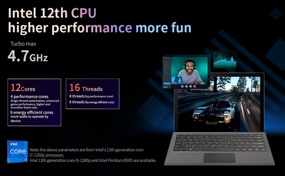 • معالج Intel الجيل الثاني عشر i5 1240P: 12 نواة و16 خيط، تعزيز يصل إلى 4.4 جيجا هرتز، مع رسم مدمج 80eu Xe.