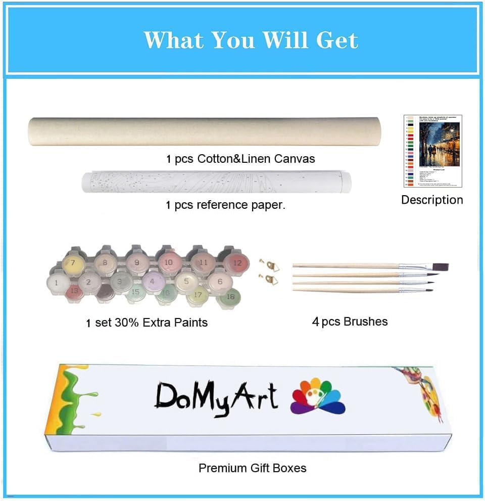 ما ستحصل عليه - 1 قطعة قماش قطنية وكتانية مطبوعة مسبقًا (16 بوصة عرض × 20 بوصة طول، بدون إطار)، مجموعة واحدة من طلاء الأكريليك عالي الجودة، 4 قطع فرش، 1 دليل بطاقات بريدية ملونة، 1 نسخة ورقية من القماش المرقم كمرجع، خطاف، معبأة في صندوق هدايا أنيق.