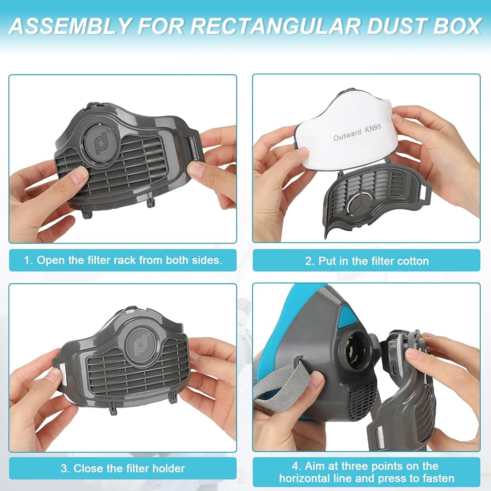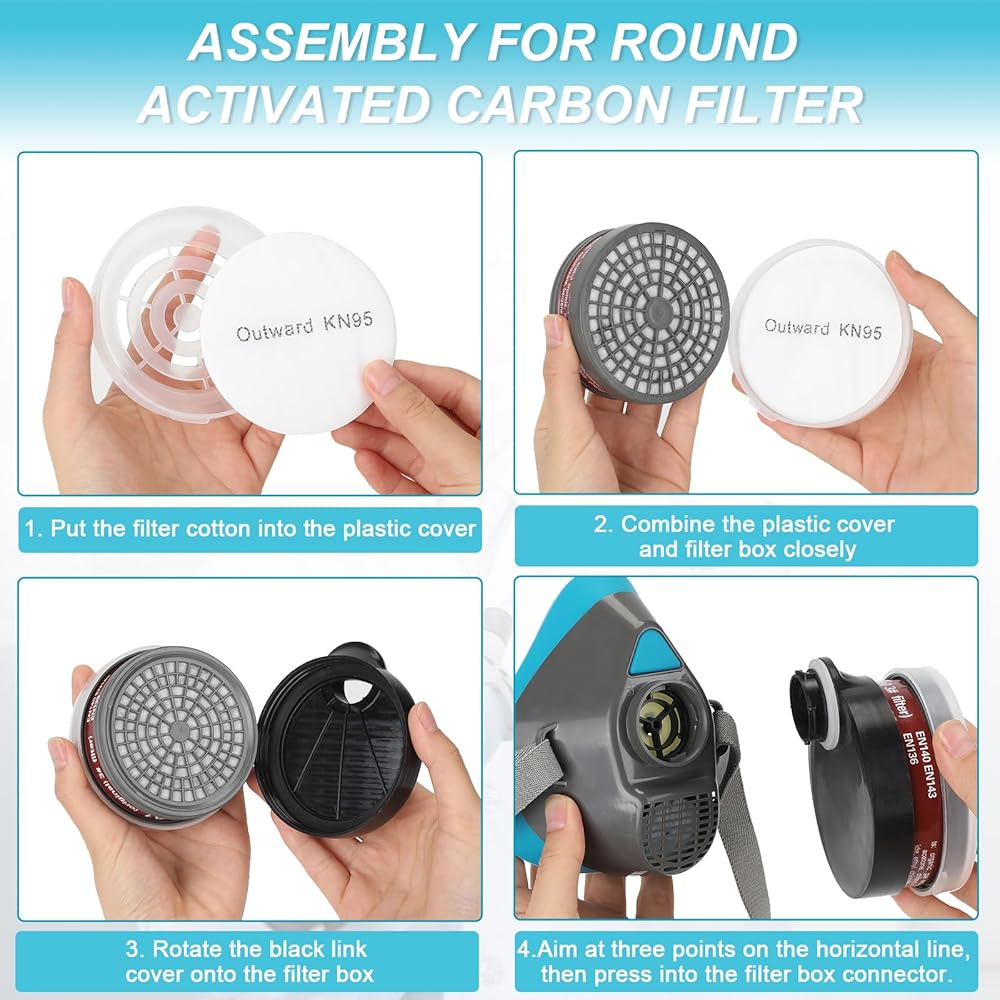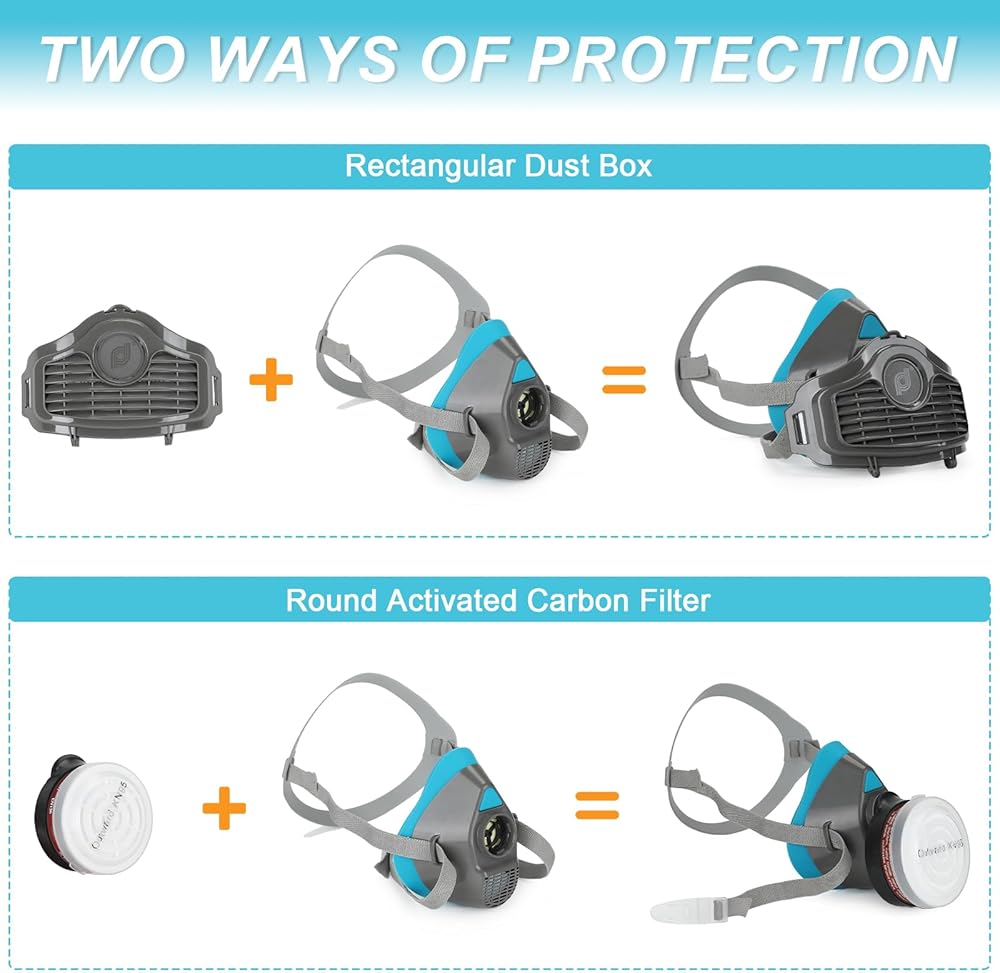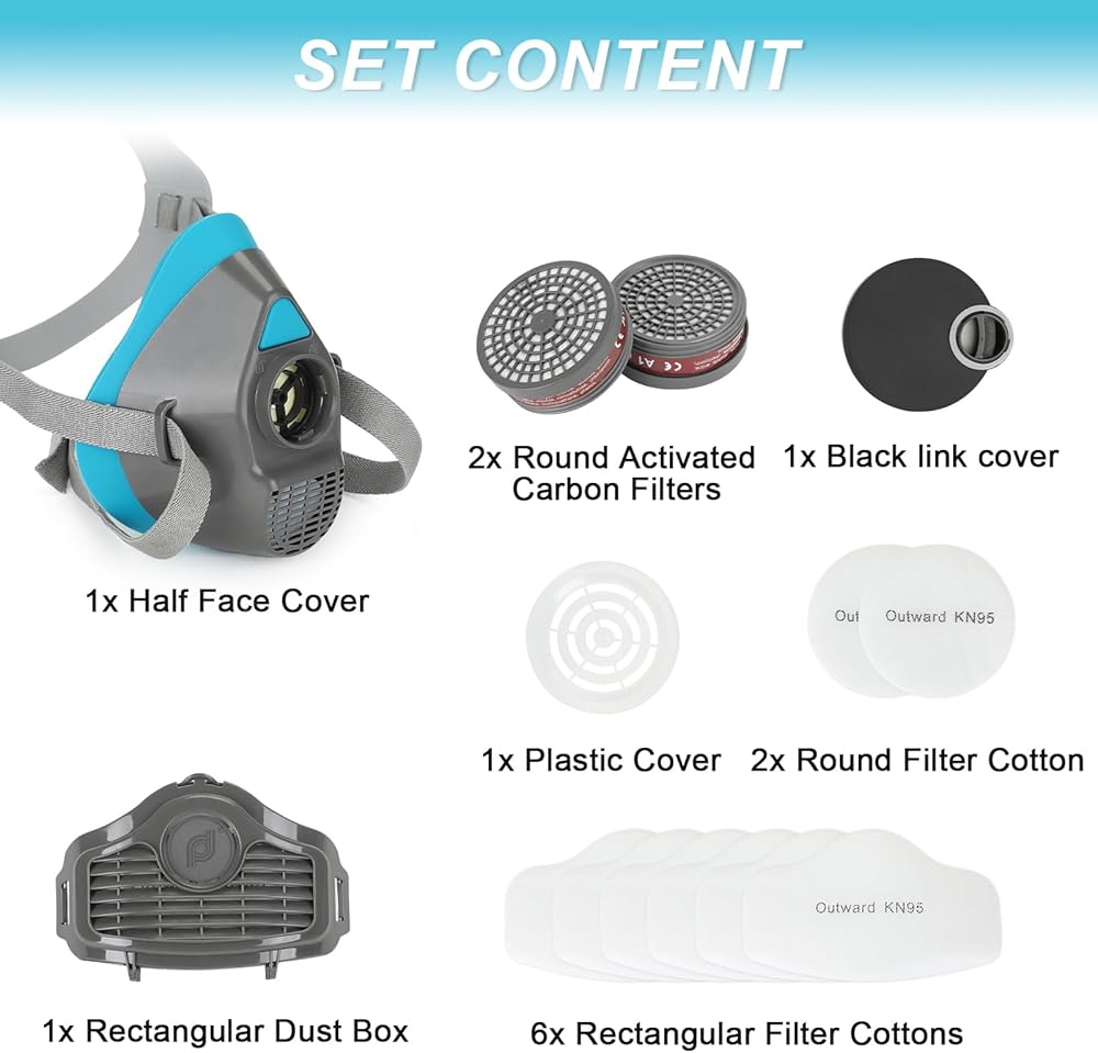 سهولة التجميع والاستخدام: سوف تحصل على 1x قناع تنفس نصف الوجه، 1x زوج من نظارات السلامة، 2x خراطيش فلتر قابلة للاستبدال، 2x أغطية خرطوشة فلتر، و10x وسادات فلتر. نحن نقدم تعليمات واضحة للاستخدام واحتياطات السلامة. لا تتردد في الاتصال بنا إذا كان لديك أي أسئلة.