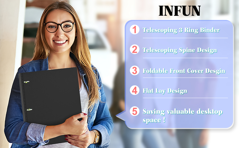 حافظة INFUN Telescoping مقاس 1 بوصة و3 حلقات: هل سئمت من المجلدات التقليدية المرهقة والمستهلكة للمساحة؟ تخيل نهجًا أكثر ذكاءً للتنظيم من خلال غلافنا الثوري خفيف الوزن بدون جهد. بفضل العمود الفقري المتداخل والتصميم الموفر للمساحة، يمكنك أخيرًا تحرير مساحة العمل الخاصة بك من الفوضى. تجربة الفرق اليوم!