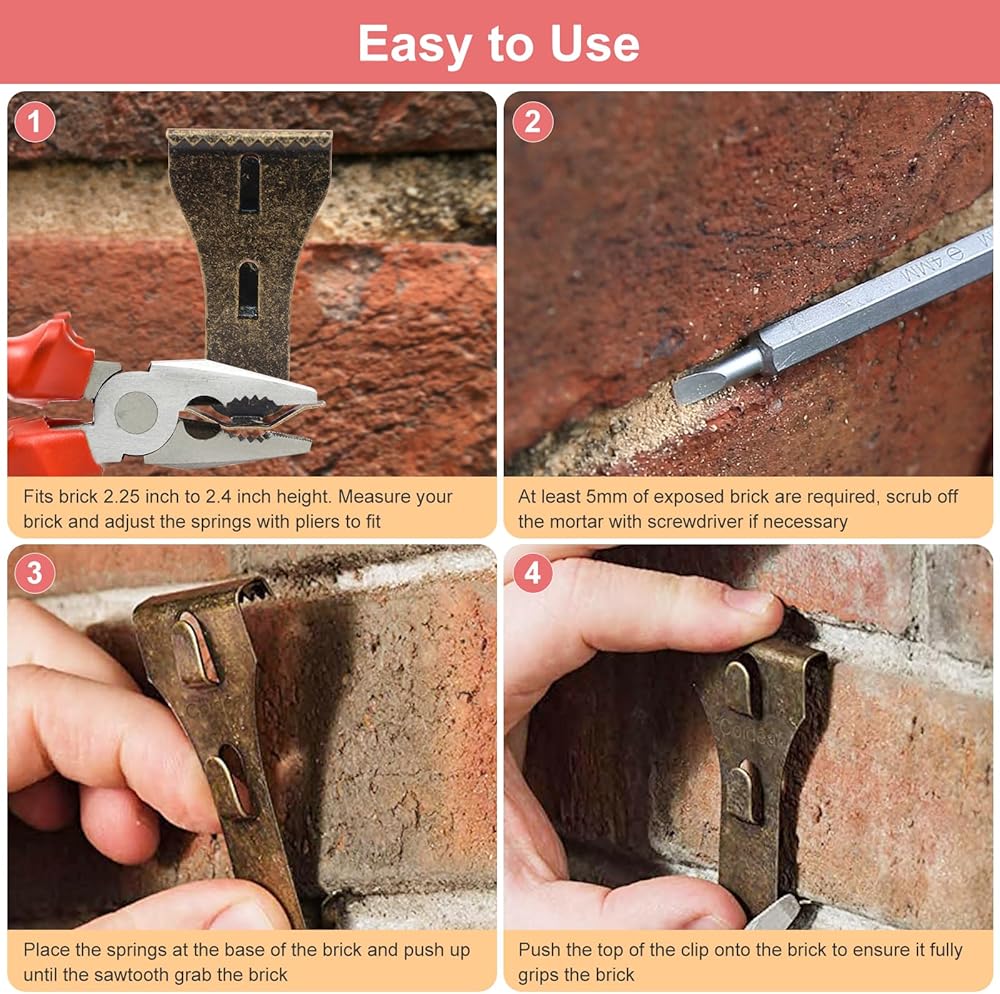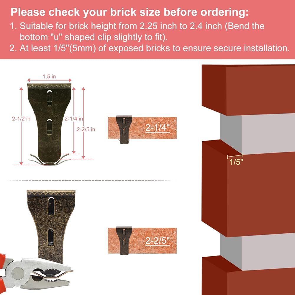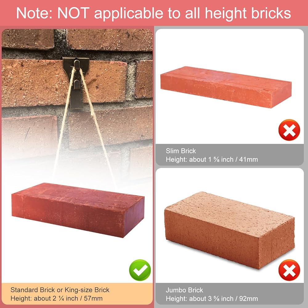 ملاءمة مثالية للطوب الخاص بك: تم تصميم مشابك الطوب الخاصة بنا لتناسب الطوب الذي يتراوح ارتفاعه بين 2.25 بوصة و2.4 بوصة، وما لا يقل عن 1/5 بوصة من السطح المكشوف. يرجى قياس الطوب الخاص بك قبل الشراء (لن يتم ربطها بكل لبنة اعتمادًا على طريقة الملاط الخاص بك).