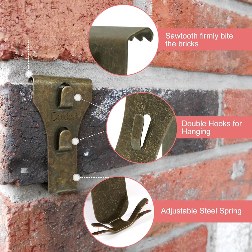 خطافات مشابك من الطوب للتعليق في الهواء الطلق - 12 قطعة معدنية من الطوب المعدني مثبت على الحائط بدون شماعات صور مثقبة لأضواء عيد الميلاد إكليل إكليل، تناسب 2 1/4 إلى 2 2/5 بوصة (برونزية)