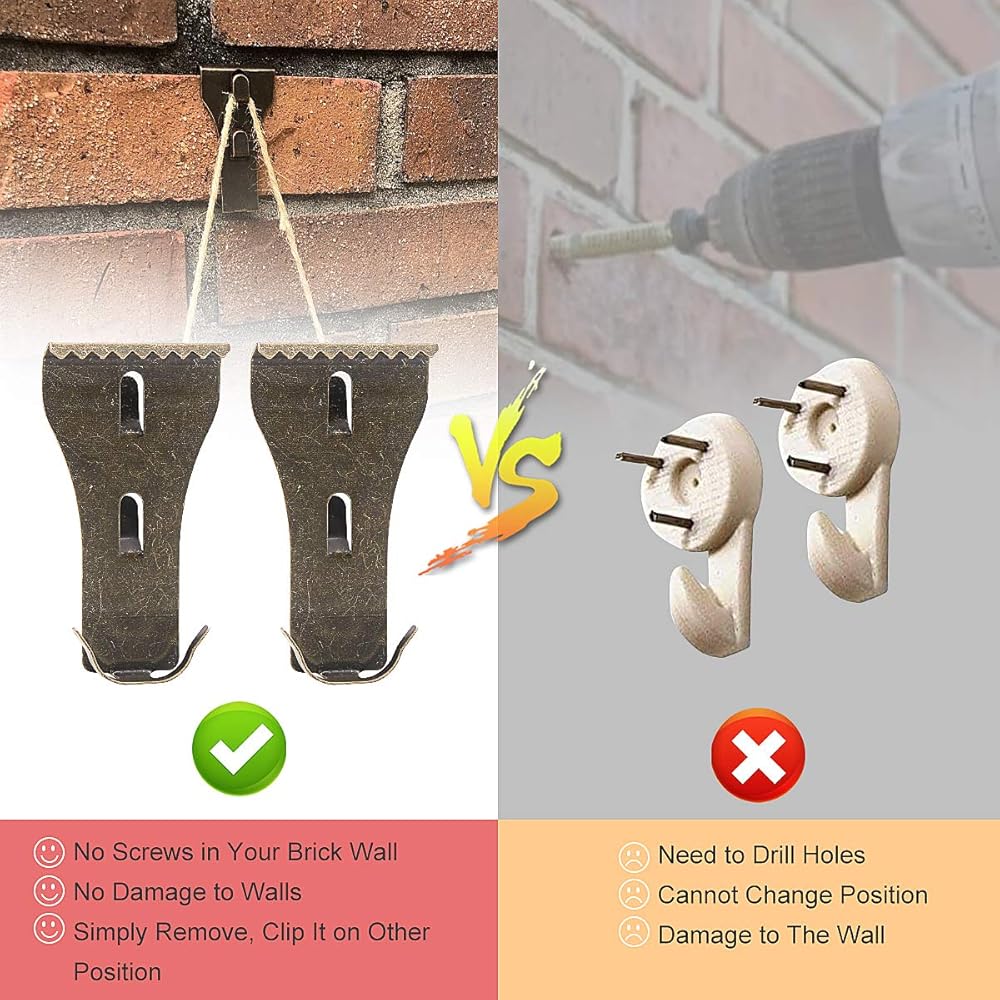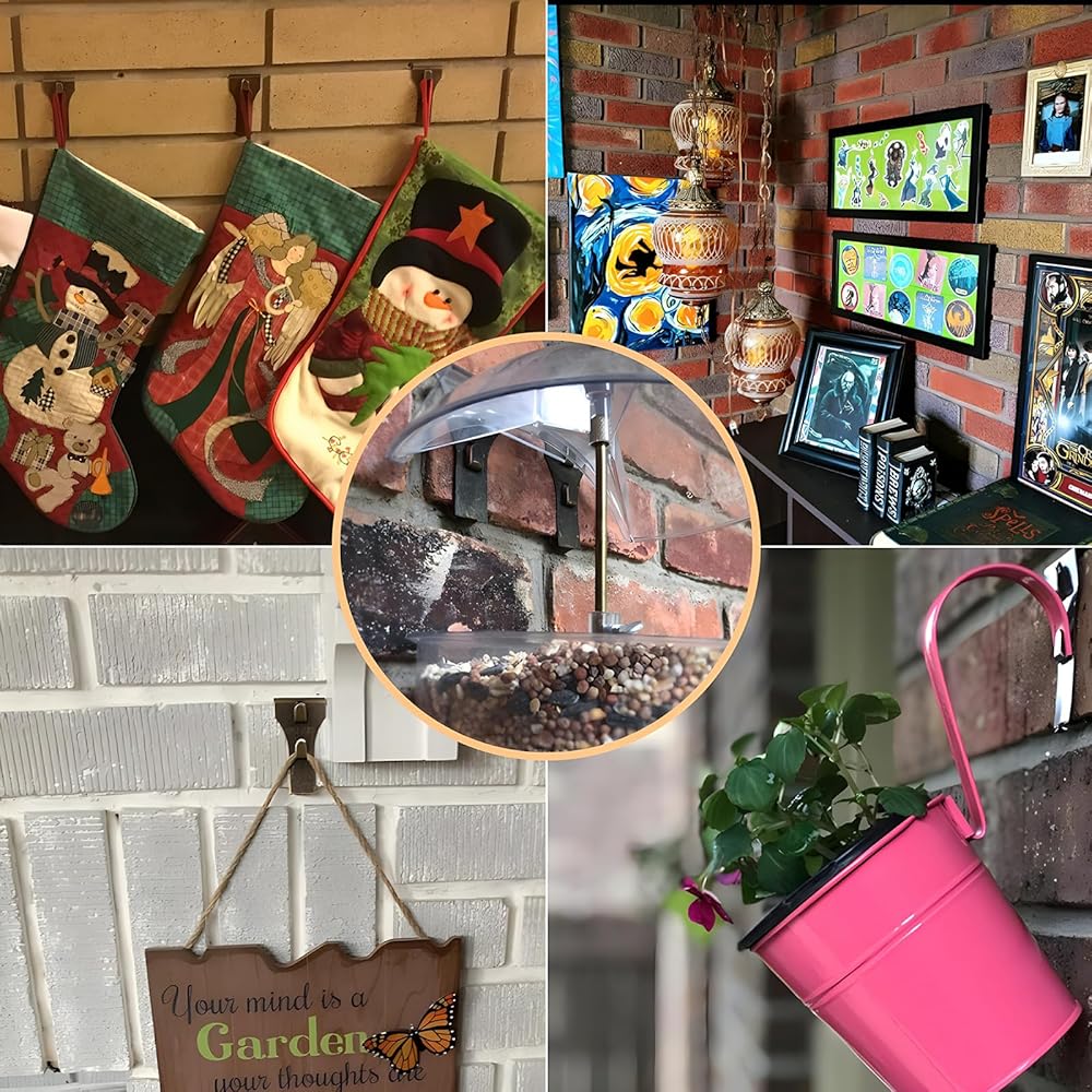 استخدامات متعددة: تعتبر خطافات الطوب الخاصة بنا رائعة لتعليق أكاليل الزهور والأضواء والجوارب وإطارات الصور وديكورات سقف عيد الميلاد والحرف اليدوية والمزيد. بالنسبة للأشياء الكبيرة، يمكن استخدام خطافات متعددة من الطوب للمساعدة في توزيع وزن الجسم. أنها تعمل بشكل جيد سواء في الداخل أو في الهواء الطلق.