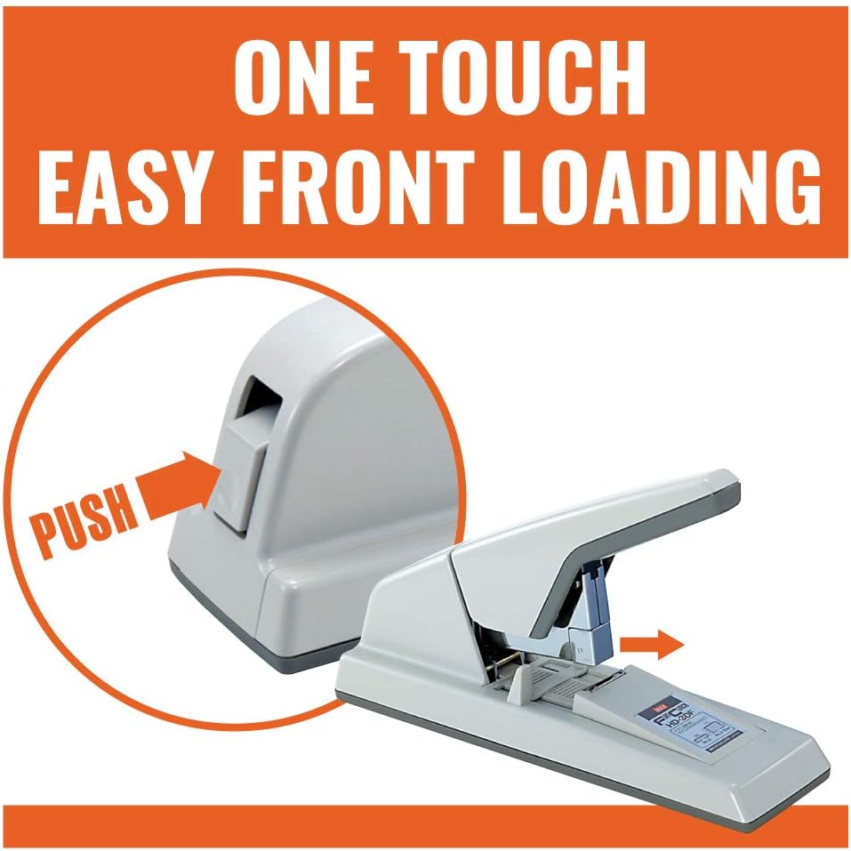 - One Touch easy front loading mechanism loads 100 strip of heavy duty staple