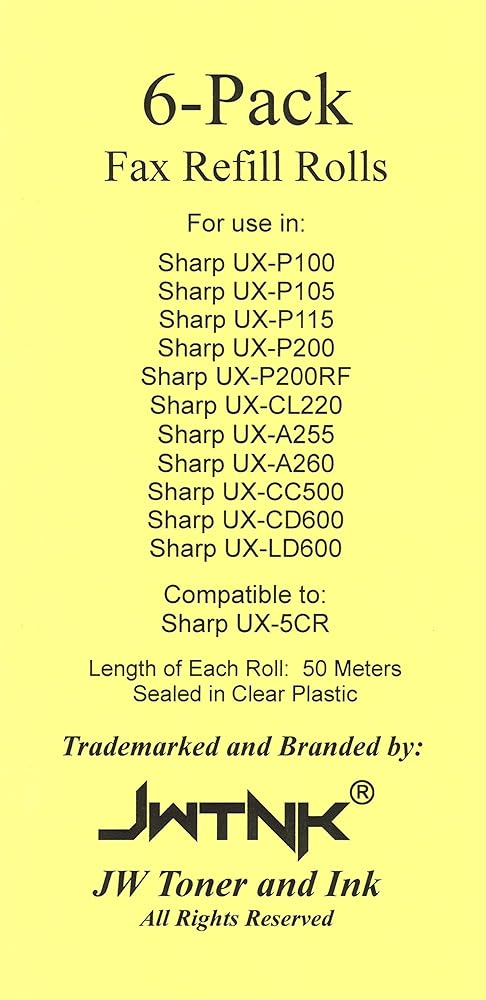 6-pack of fax film ribbon refill rolls compatible with the following Sharp fax machines: UX-P100 UX-P105 UX-P115 UX-P200 UX-P200RF UX-CL220 UX-255 UX-A255 UX-260 UX-A260 UX-CC500 UX-CD600 UX-LD600. Compatible to original Sharp UX-5CR fax refill rolls. Model and brand names, used here for reference only, belong to their respective owners.