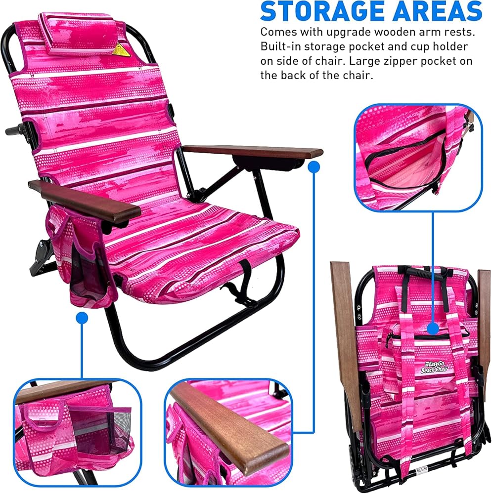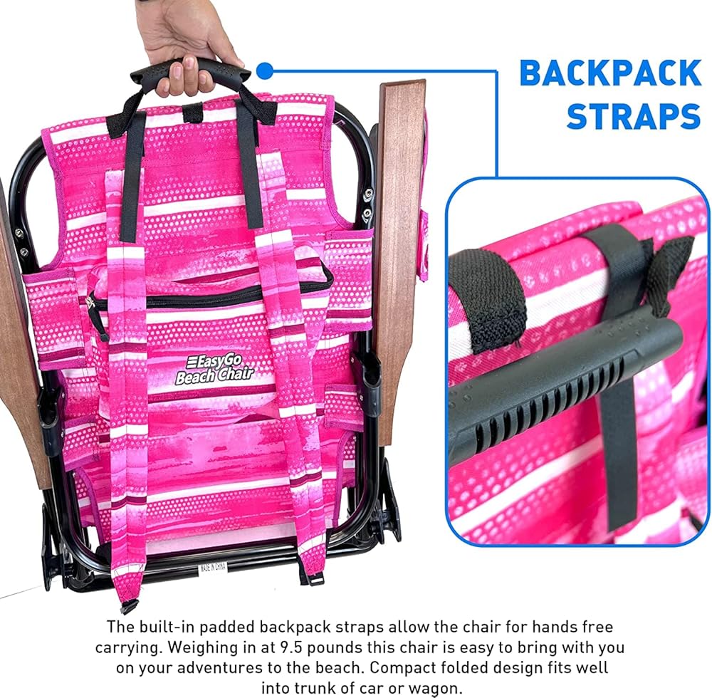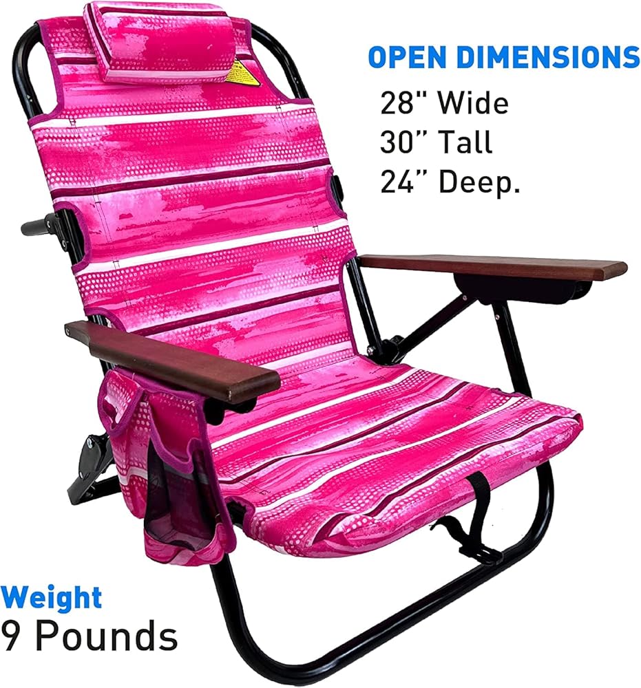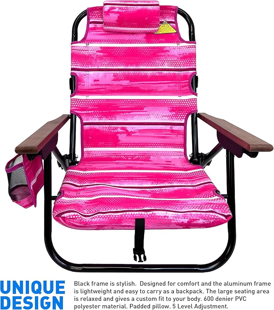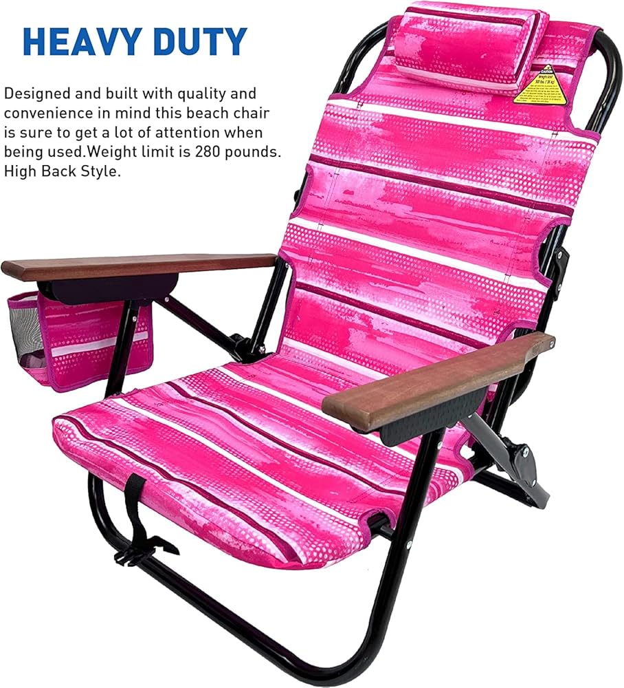 Black frame is stylish. Designed for comfort and the aluminum frame is lightweight and easy to carry as a backpack. The large seating area is relaxed and gives a custom fit to your body. 600 denier PVC polyester material. Padded pillow. 5 Level Adjustment. Designed and built with quality and convenience in mind this beach chair is sure to get a lot of attention when being used. Weight limit is 280 pounds. High Back Style. OPEN DIMENSIONS: 28" Wide x 30” Tall x 24” Deep. Weight: 9 Pounds. Comes with upgrade wooden arm rests. Built-in storage pocket and cup holder on side of chair. Large zipper pocket on the back of the chair. The built-in padded backpack straps allow the chair for hands free carrying. Weighing in at 9.5 pounds this chair is easy to bring with you on your adventures to the beach. Compact folded design fits well into trunk of car or wagon. We are so confident in the quality and design of this beach chair that if you don't agree that this is the most quality, compact, convenient and comfortably designed beach chair then simply return it within 30 days for a full refund.