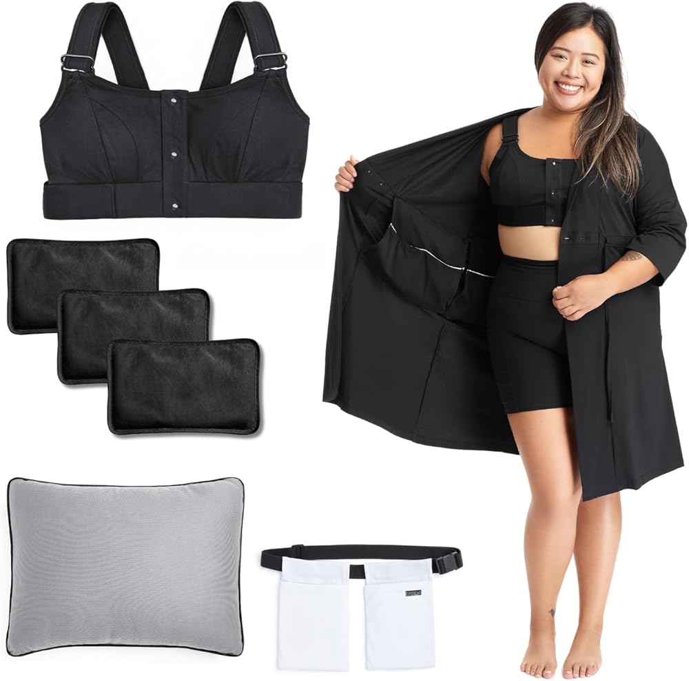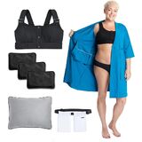 تشمل الحزمة: (1) حمالة صدر بإغلاق أمامي؛ (1) رداء التعافي من العمليات الجراحية؛ (1) وسادة جيب؛ (1) حزام حامل الصرف بعد العمليات الجراحية؛ (3) عبوات علاج جل ساخن/بارد