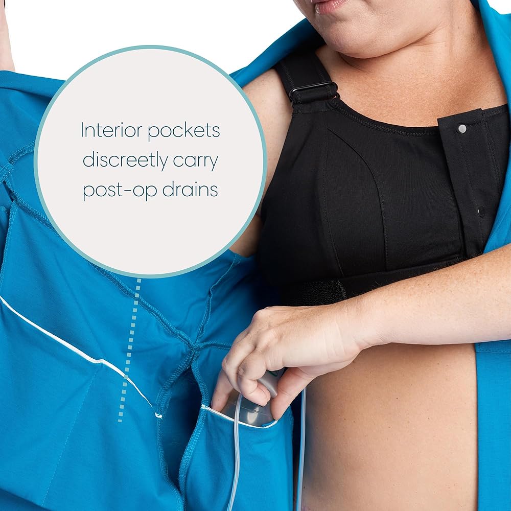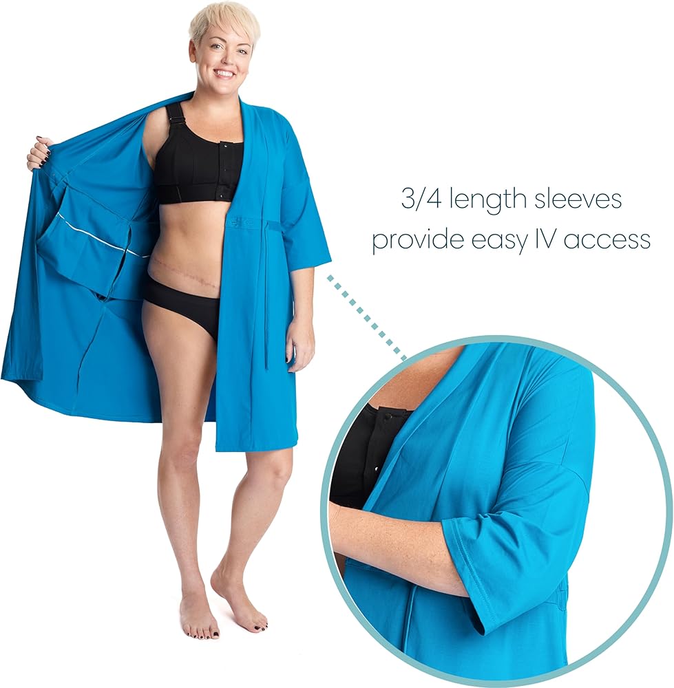 يحتوي رداء التعافي على 6 جيوب داخلية (3 على كل جانب) حيث توفر حاملات الصرف إدارة تصريف JP أكثر راحة وأسهل بعد العمليات الجراحية. أكمام بطول ثلاثة أرباع (3/4) لسهولة الوصول إلى الوريد أثناء العلاج.