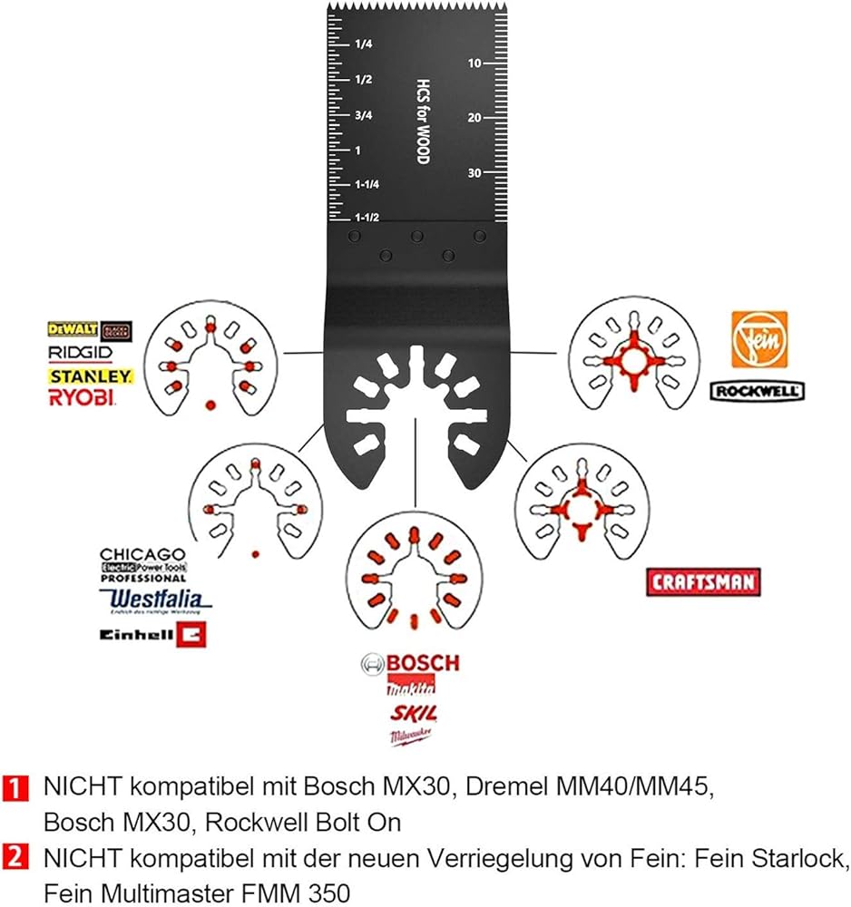 • Universa Compatible System-- Our quick release saw blades are compatible with many oscillating tools on the market such as Fein Multimaster, Ryobi, Milwaukee, Hitachi, Black & Decker, Chicago, Craftsman, Dewalt and others.