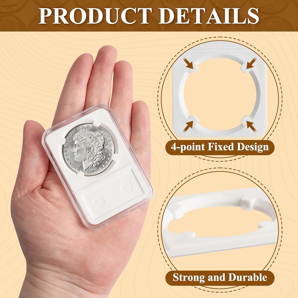 خامة عالية الجودة: هيكل حامل العملات المعدنية مصنوع من البلاستيك عالي الجودة، وهو متين وليس من السهل أن يتلف. تم تجهيز كل حامل عملات معدنية بالدولار الفضي بحشوات مطاطية بيضاء. المزيد من التصميم الاحترافي سيمنحك تجربة أكثر متعة.