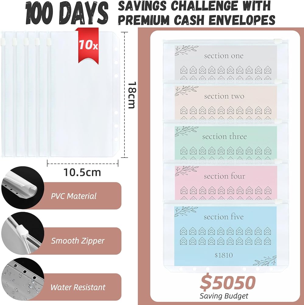 💰️【محتويات توصيل فعالة للغاية من حيث التكلفة】تتضمن العبوة 35 قطعة: مجلد A6 من جلد البولي يوريثان (قطعة واحدة)، أظرف بسحاب (10 قطع)، متتبع تحدي 100 ظرف (5,050 دولارًا × قطعتين)، تحدي واحد دولار (قطعتان)، تحدي 5 دولارات ( قطعتان)، تحدي 10 دولار (قطعتان)، تحدي 20 دولارًا (قطعتان)، تحدي 50 دولارًا (قطعتان)، تحدي 100 دولار (قطعتان)، قطعتان من بطاقات توفير المال الفارغة DIY.