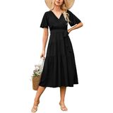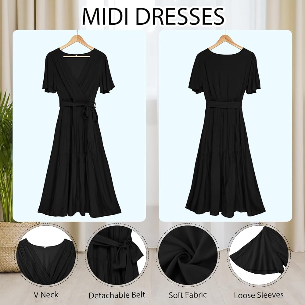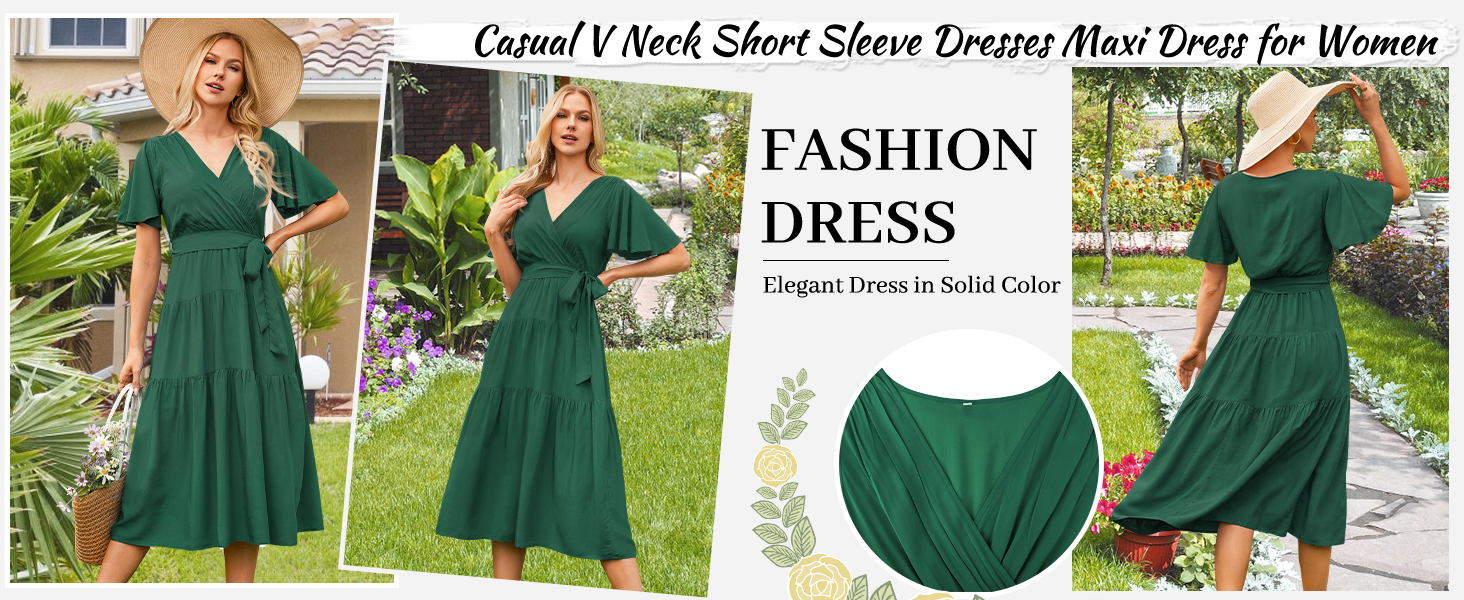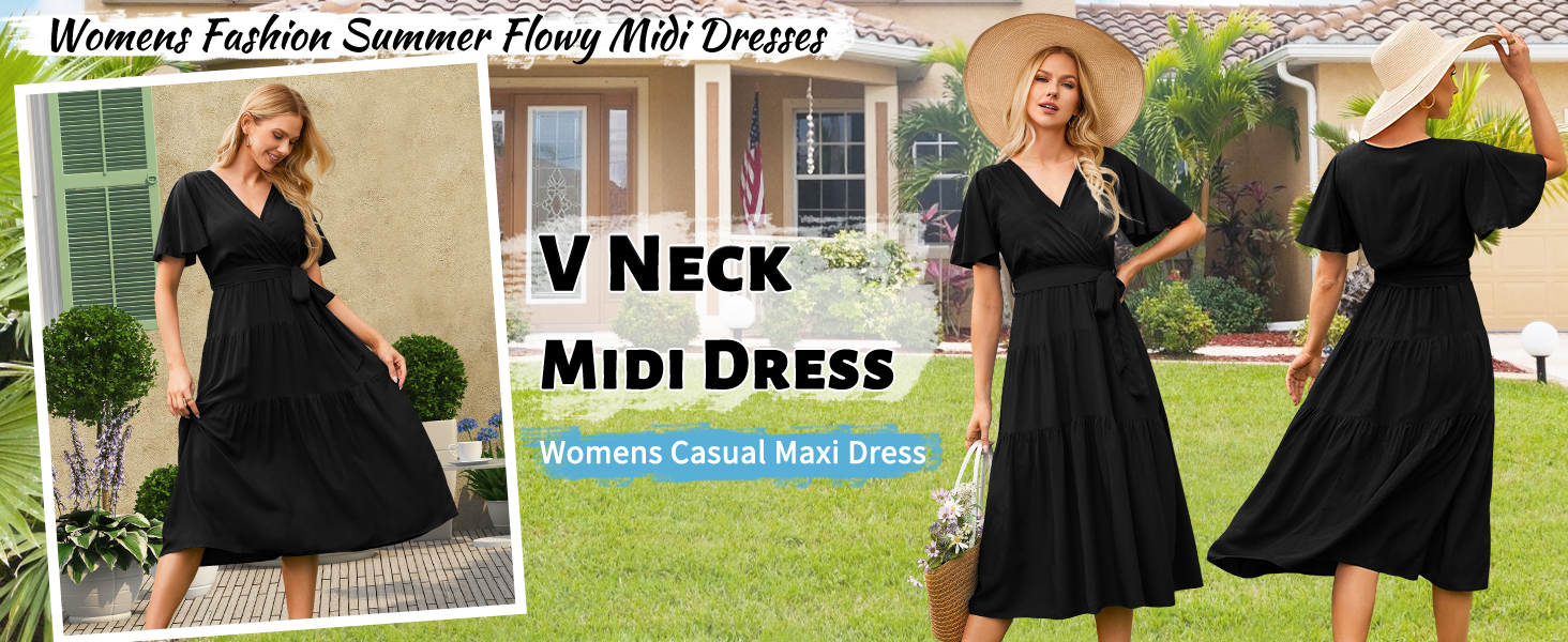 V-neck Design: Summer black midi dresses for women 2024 use a classic V-neck design, wear this swing casual v neck long dress with belt for women can show a woman's attractive collarbone line. This blue flowy short sleeve dresses accentuates a woman's neck line and bust curve.