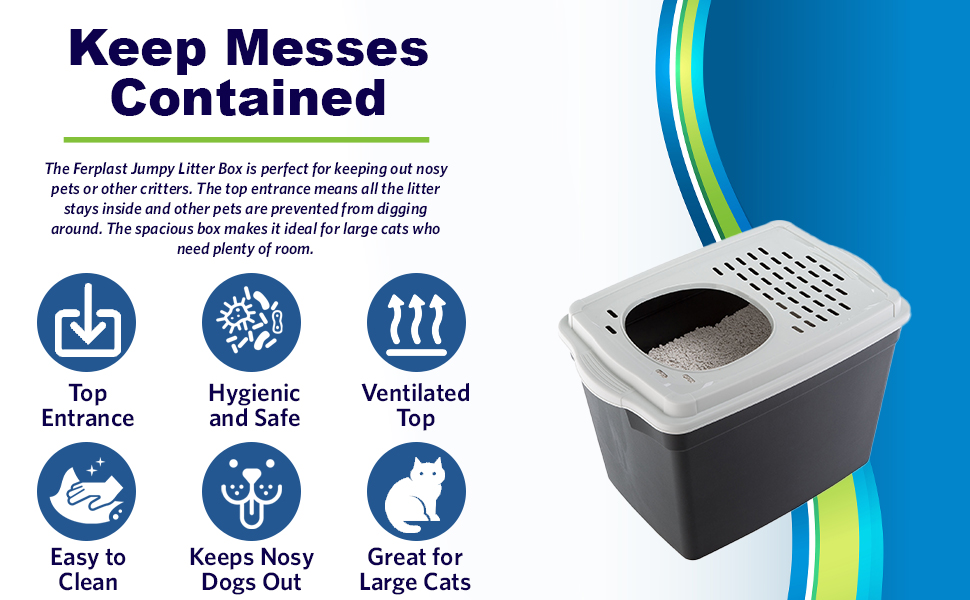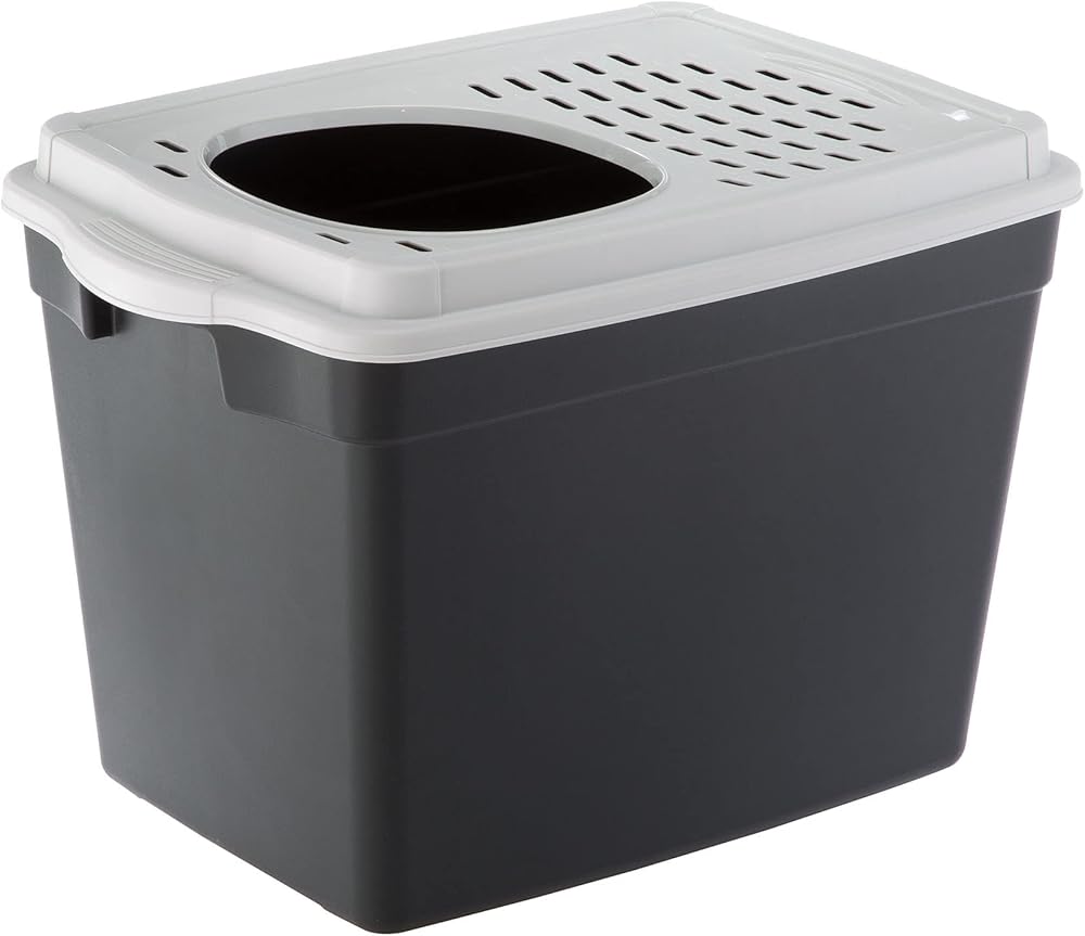Covered cat litter box with top entrance helps prevent litter from spilling out and stops dogs from nosing about or digging. Keeps cat's feet clean