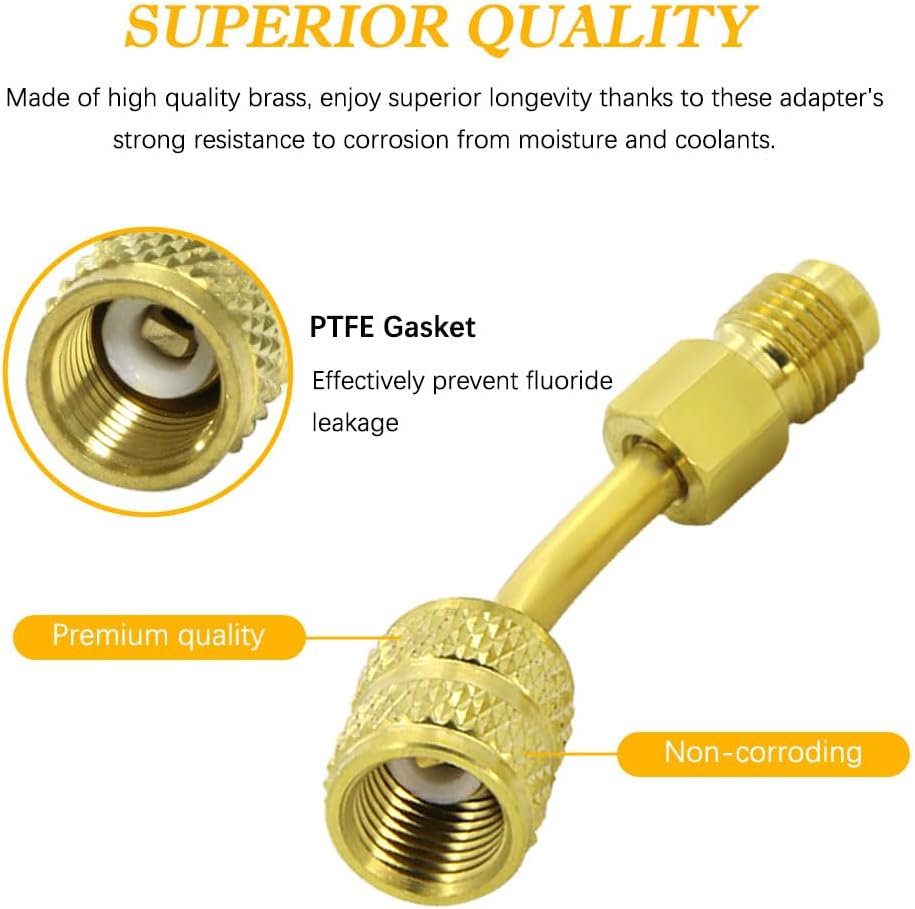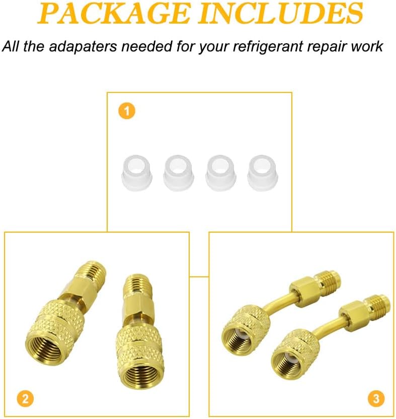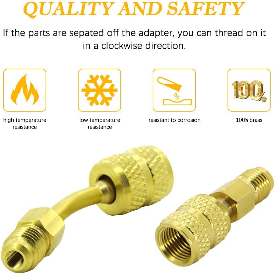 • Material: The R410A adapters are constructed with brass alloy which is totally rust and corrosion resistant. The air conditoner hose adapter with these kind of brass material gains high strength and high hardness.