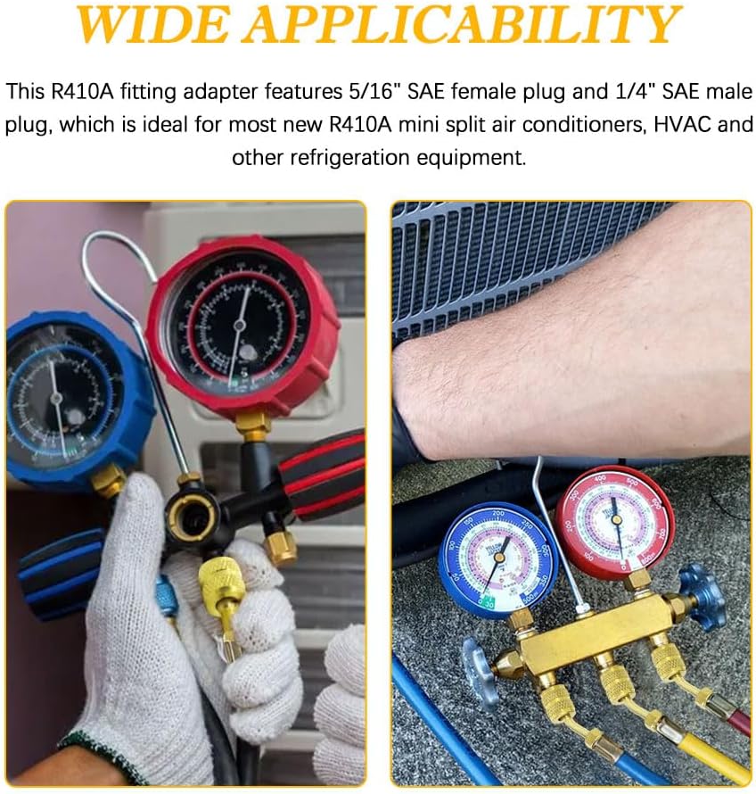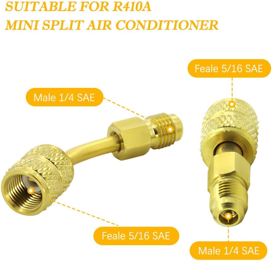 • Specifications: The air conditioner adapters have 5/16" SAE female plug and 1/4" SAE male plug whcih are most compatible for most R410A mini split air conditioners, HVAC and other refrigeration equipment