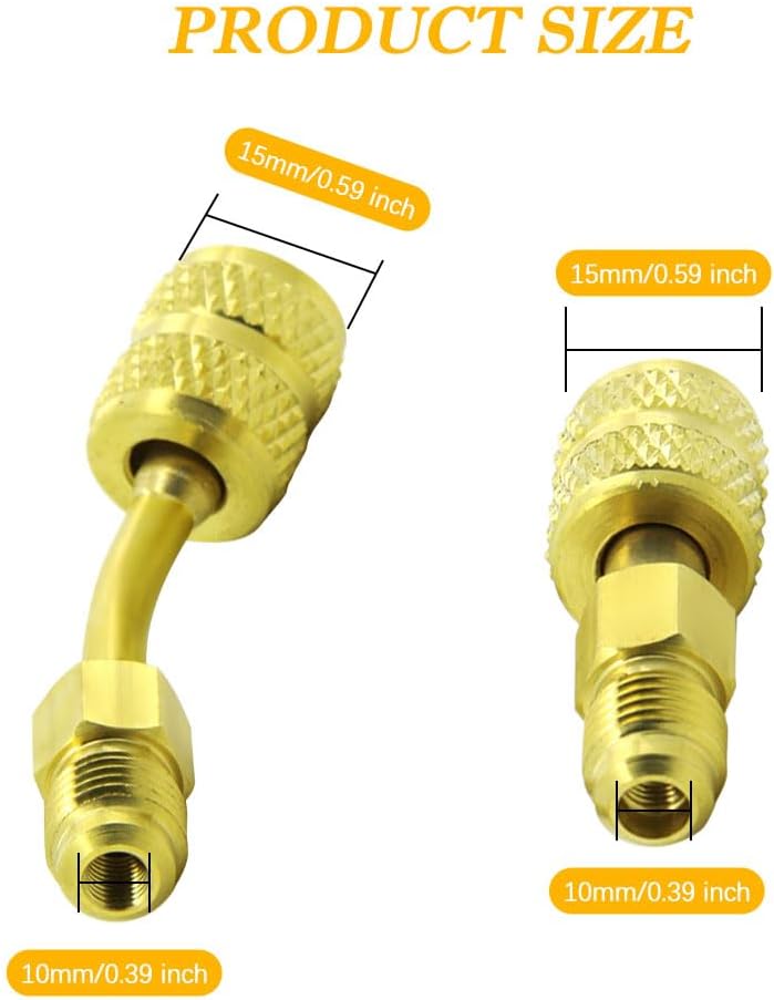 Package: There are 2 kinds of adapters in the package. 1PC straight adapter and 1pc angled adadpter of 45 degrees. These R410A adapters 5/16" sae female quick couplers to 1/4" sae male flare.