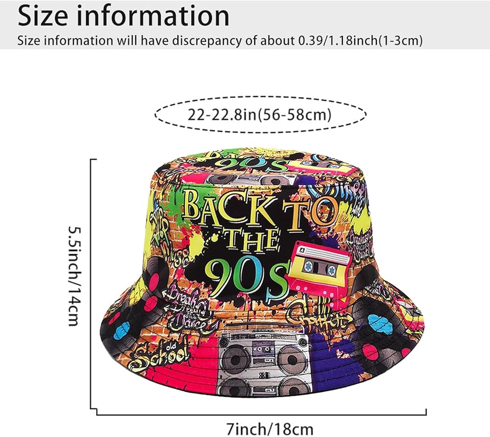 The Size of 80s 90s Accessories for Women Men Bucket Hat: Circumference: 22-22.8 inch/56-58cm; Brim: 2.36 inch/6cm; Crown: 3.35 inch/8.5cm. 80s 90s costumes for men women beach bucket hat is foldable and packable, it's easy to carry in your bag, suitcase, handbag or purse. These sun hats for summer are suitable for women/men/teens.