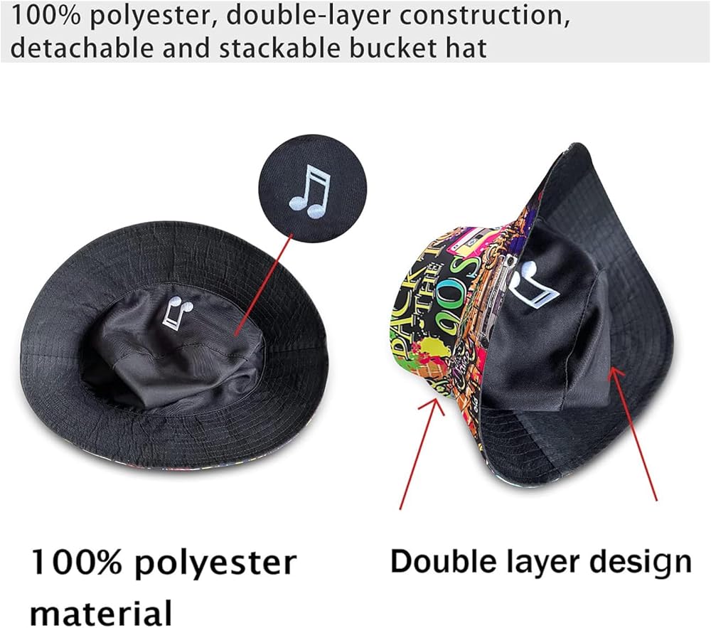 80s 90s Outfit Women Men Bucket Hat Material: Rave 80s 90s bucket hats for women men is made of 100% polyester twill fabric,which is soft, skin-friendly, breathable, lightweight and not easy to fade, durable and washable,Our back to the 80s 90s bucket hat will give you sun protection to keep you cool and comfortable.