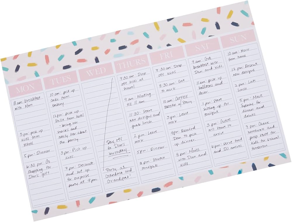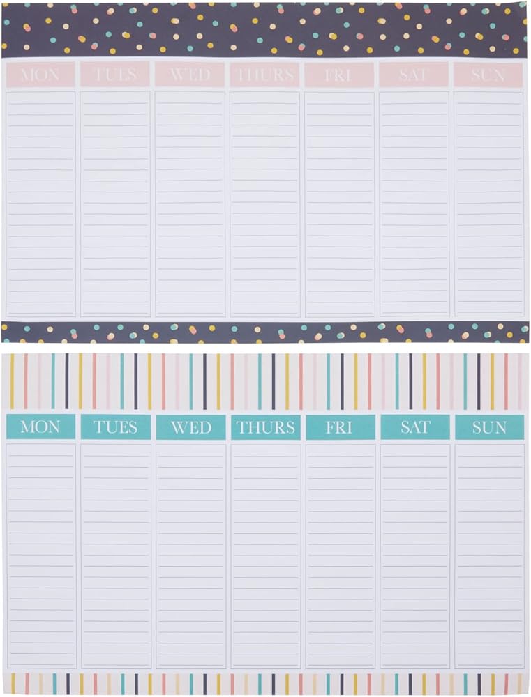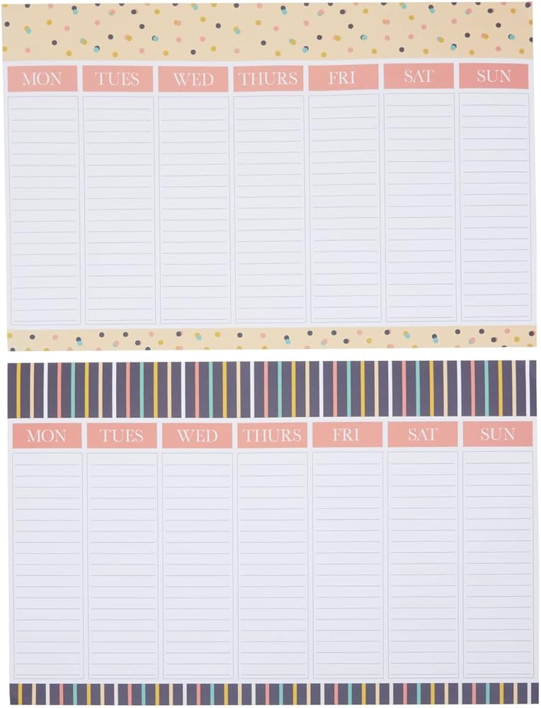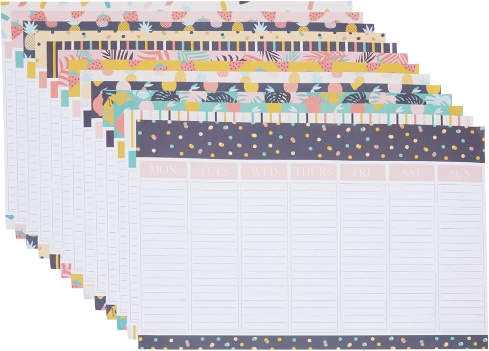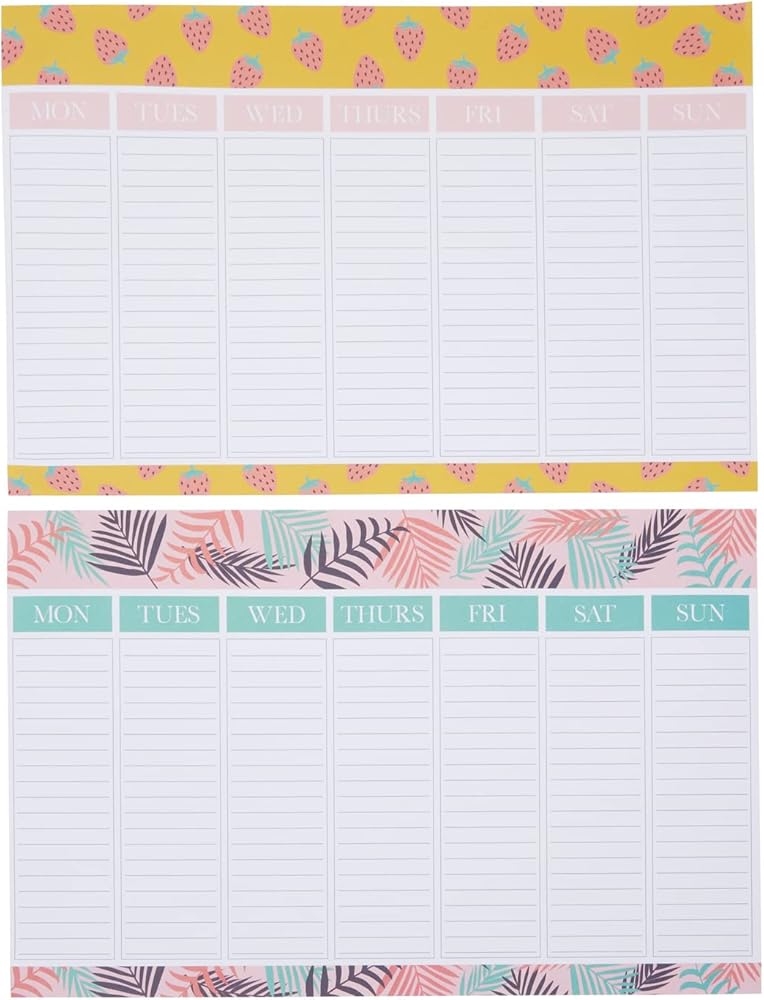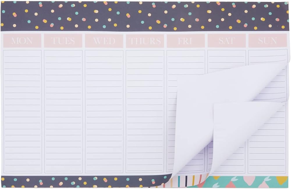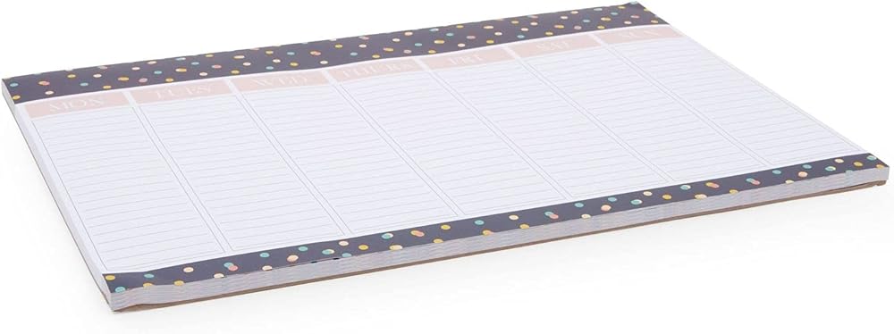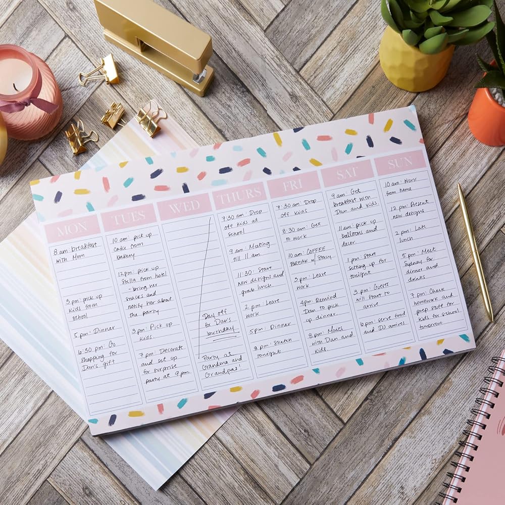 Keep your daily tasks, bill reminders, grocery lists, and notes organized with this blank weekly planner pad. The weekly calendar measures 11 x 17 inches, perfectly sized to fit on top of your desk or workspace without taking up too much space. Each day of the week has lined columns to ensure you have more than enough writing space for your daily reminders, meal planning, and tasks. The weekly notepad has 52 thick paper sheets with glue at the top for convenient tear off at the end of the week.