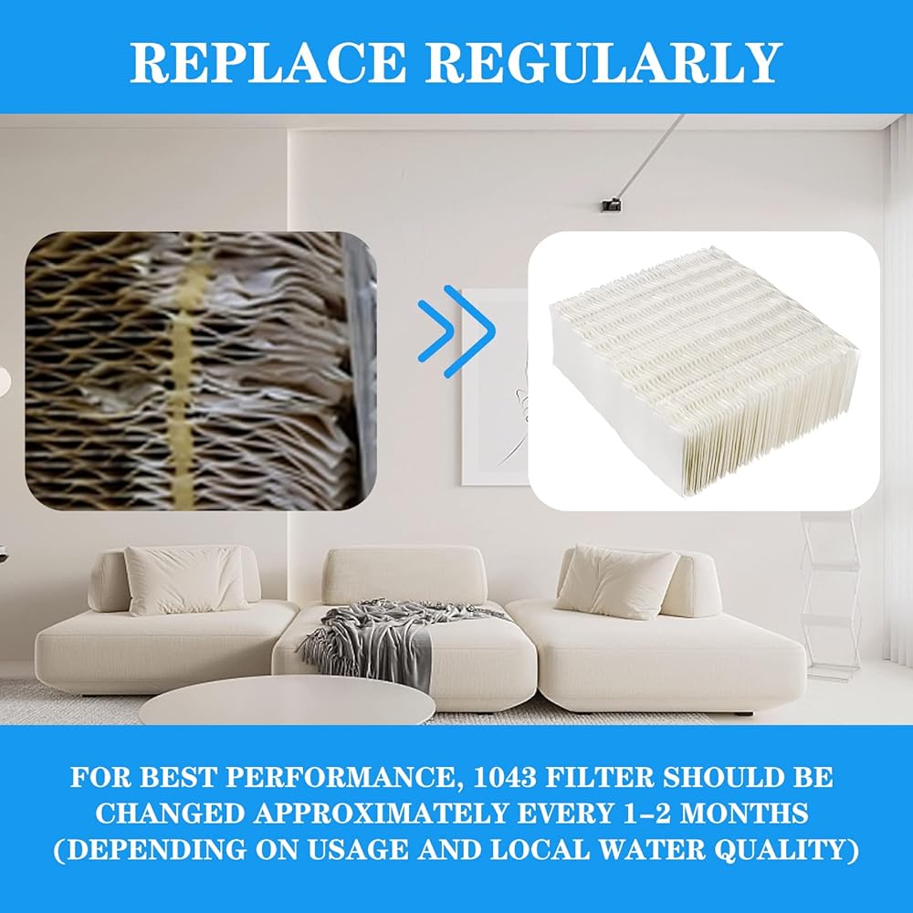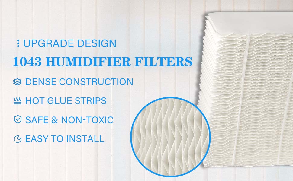 فلتر مرطب عالي الكفاءة: يمكن لفلتر الفتيل المرطب 1043 للعناية بالهواء تصفية المعادن من الماء لتقليل الغبار الأبيض. يعمل فلتر امتصاص المرطب 1043 على توزيع الرطوبة في الهواء لتحسين جودة النوم والحفاظ على رطوبة البشرة ومنع التهاب الحلق وغير ذلك الكثير. مناسبة خاصة لفصل الشتاء الجاف.