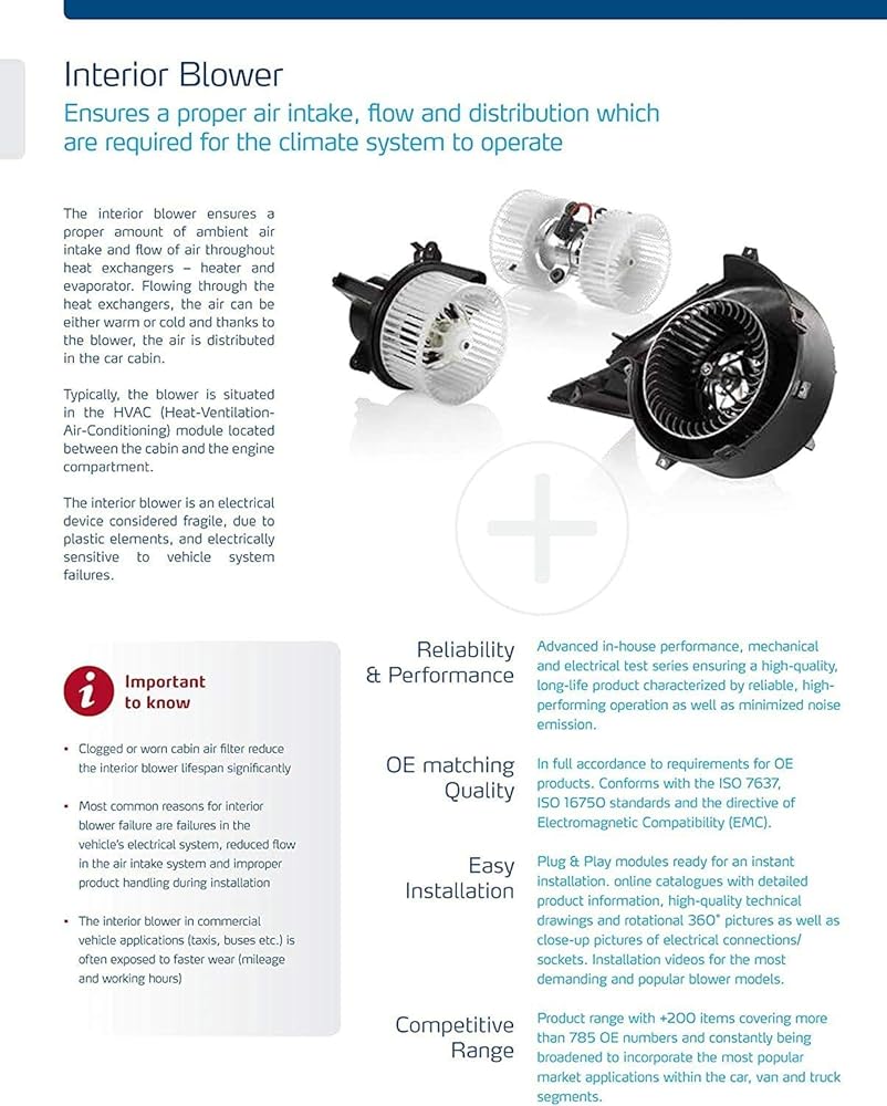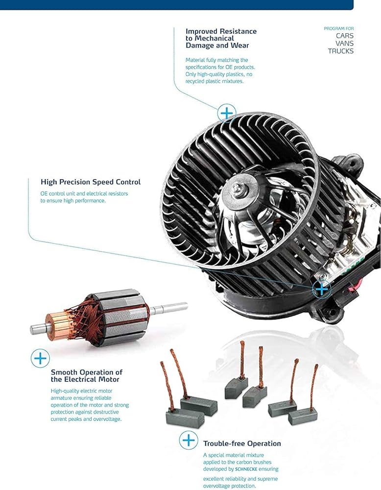 Materials are matching the same requirements as OE products. Only high-quality plastics, no recycled plastic mixtures.OE control unit and electrical resistors to ensure high performance.High-quality electric motor armature ensuring reliable operation of the motor and strong protection against destructive current peaks and overvoltage.