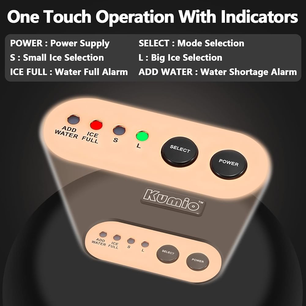 【لوحة تحكم بسيطة ومؤشرات إنذار】آلة صنع الثلج الأوتوماتيكية سهلة التشغيل. أضف الماء واضغط على زر الطاقة، وحدد حجم الثلج وهذا كل شيء. عندما تكون المياه غير كافية أو تكون سلة الثلج ممتلئة، سيضيء ضوء المؤشر لتذكيرك.