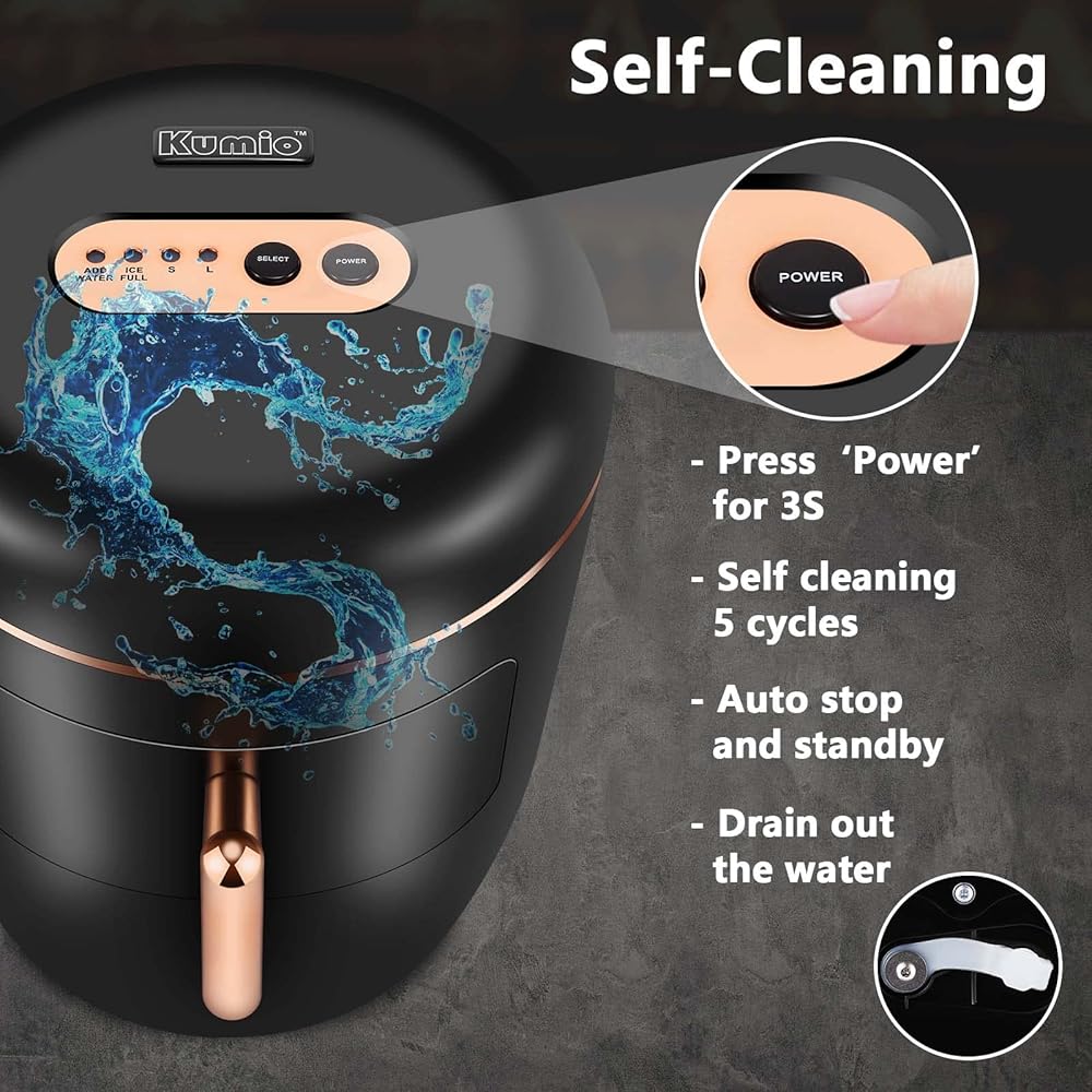 【التنظيف التلقائي والرصاص الثلجي الصحي】اضغط على زر الطاقة لمدة 3 ثوانٍ لبدء عملية التنظيف الذاتي. بعد 5 دورات، سيتوقف سطح عمل صانع الثلج تلقائيًا ويدخل في وضع الاستعداد. إن استخدام منفذ الصرف لتفريغ مياه الصرف الصحي في الوقت المناسب سيضمن حصولك على ثلج طازج وصحي في أي وقت.