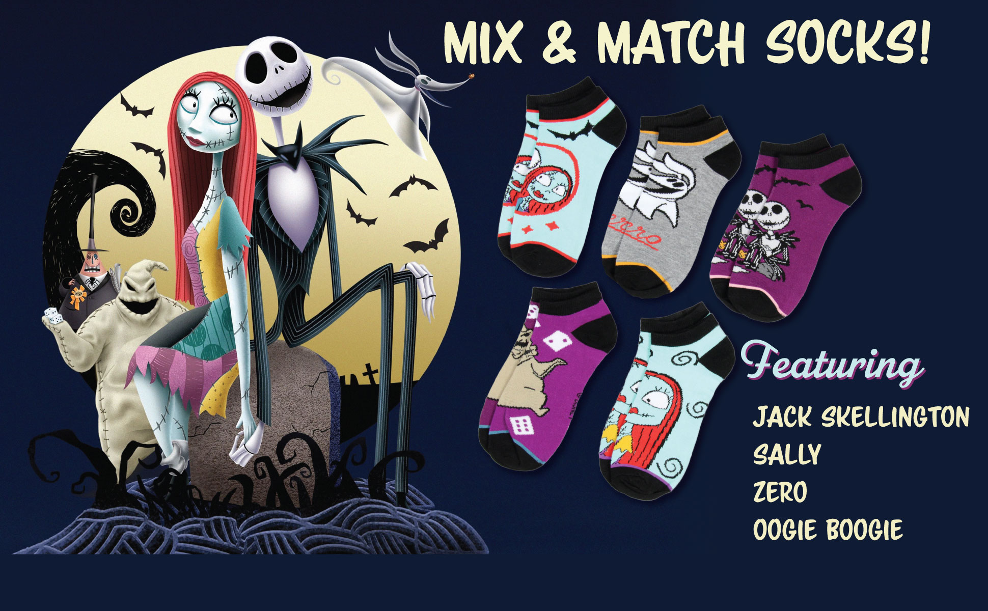 - 5 تصميمات ممتعة للمزج والمطابقة: 1 سالي، 1 جاك وسالي، 1 أوجي بوجي، 1 زيرو، 1 جاك سكيلينغتون مع زيرو