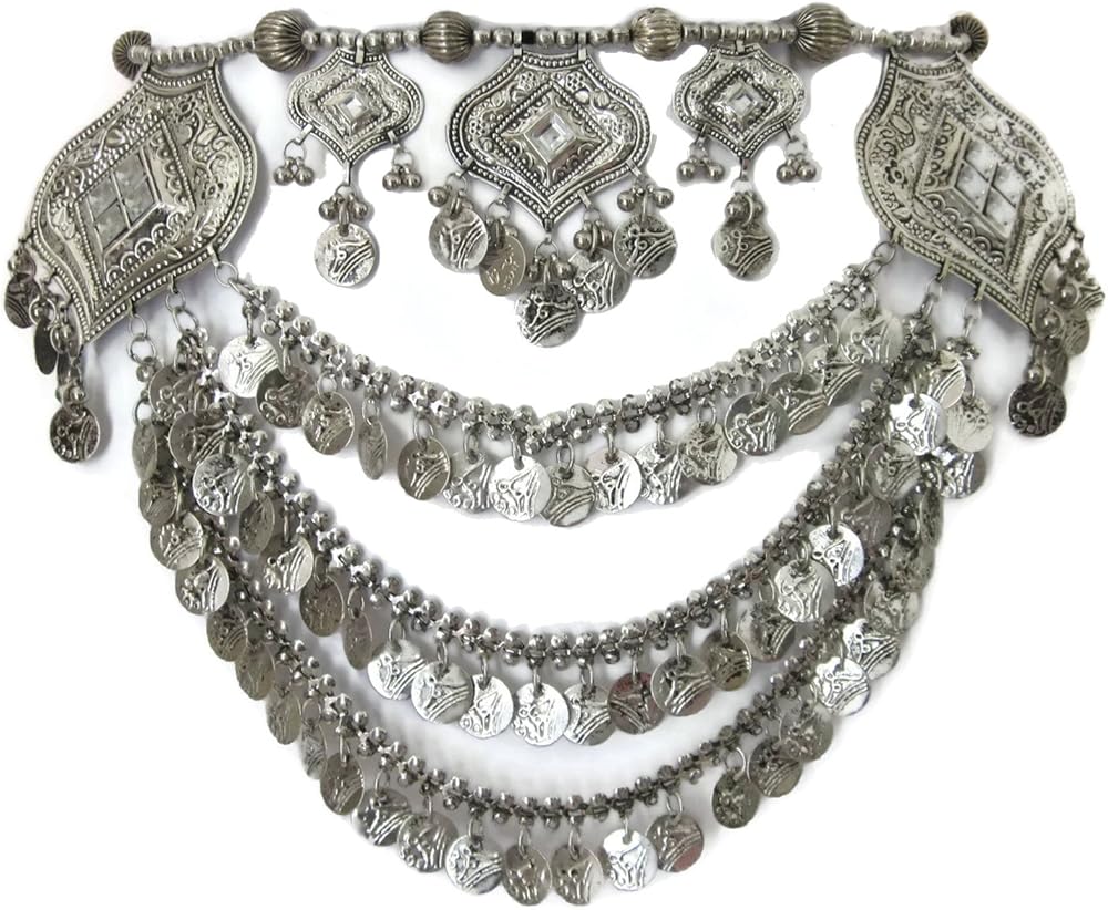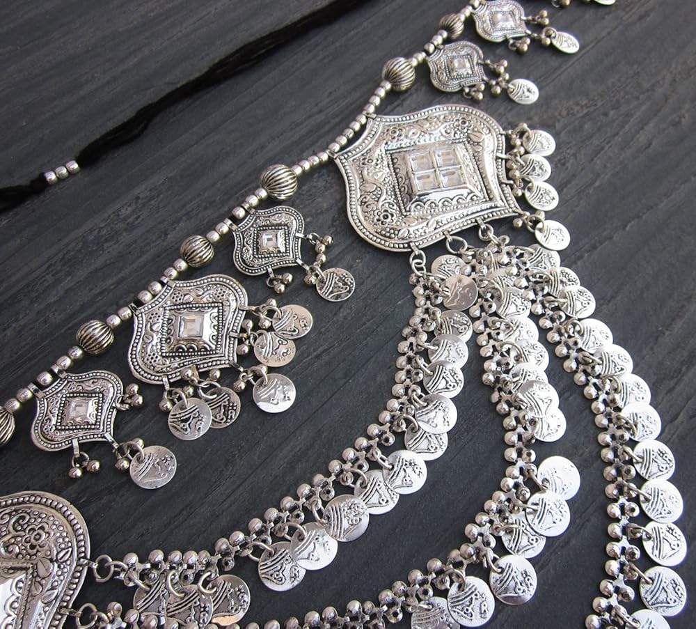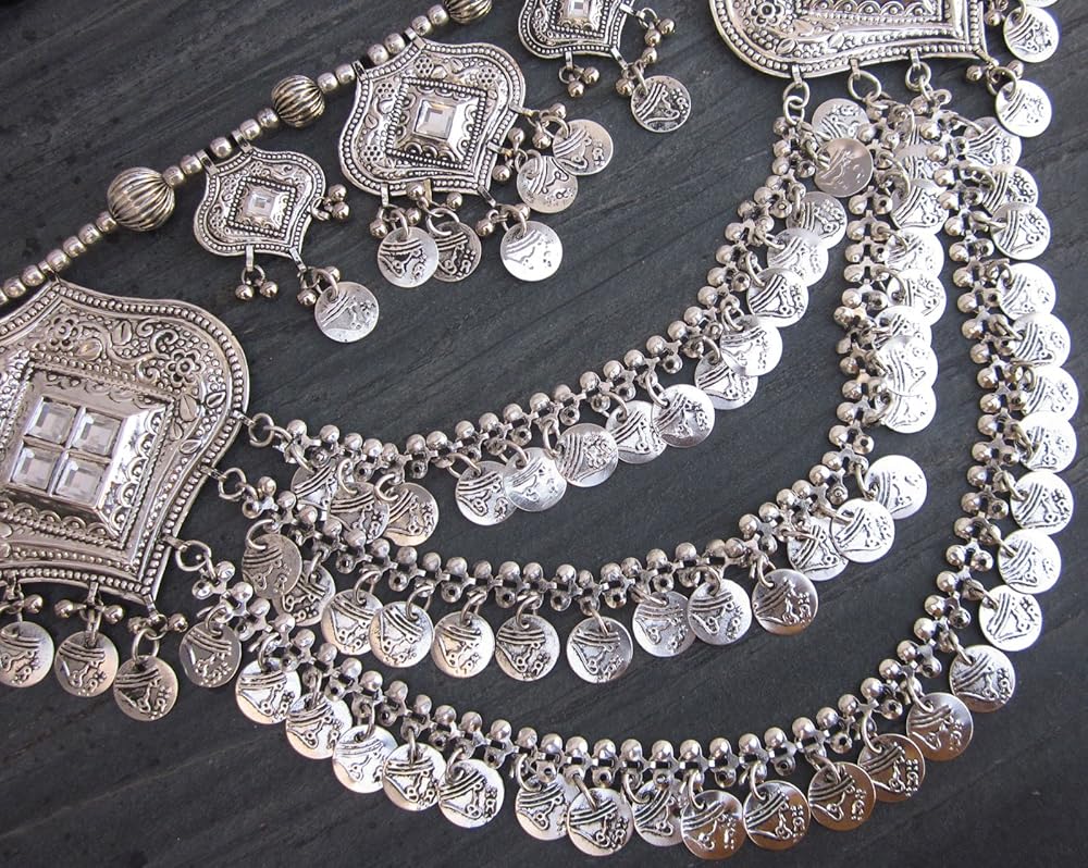 All metal silver plated oxidized finish. Soldered hook hand press embossed pendant medallions with coin chain dangles. Handmade in India with love and labor . Invaluable handicraft for value. An addition to your style wardrobe or a gift for someone you love.