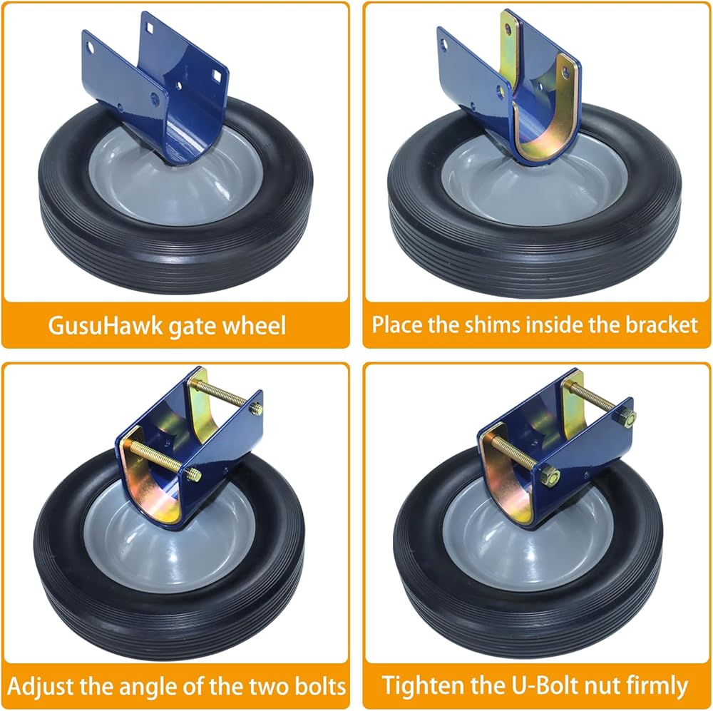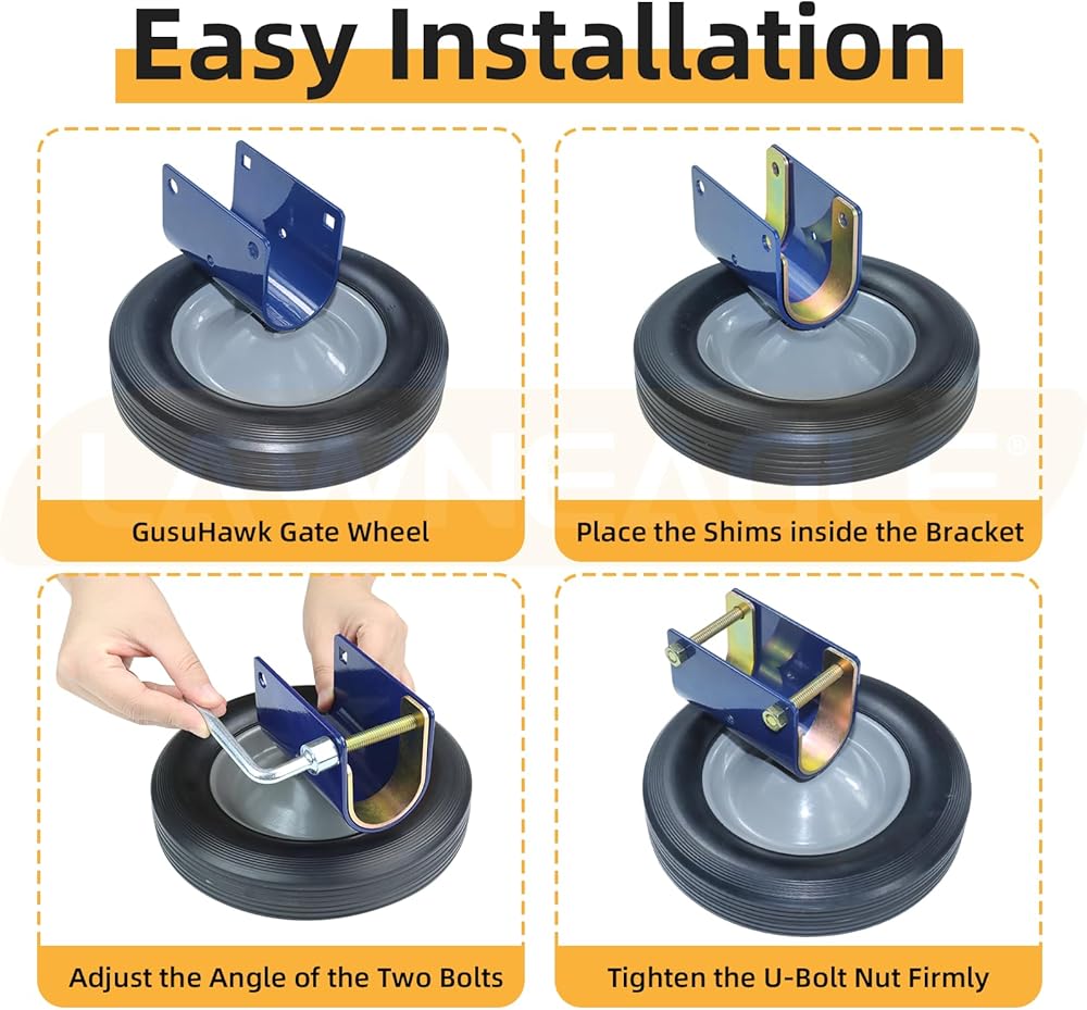 EASY INSTALLATION: First Install the Gate Wheel on the Bottom Rail on the Side of the Gate, and Adjust the Angle to Ensure the Wheel Touches the Ground, Finally Tighten the U-Bolt nut Firmly.
