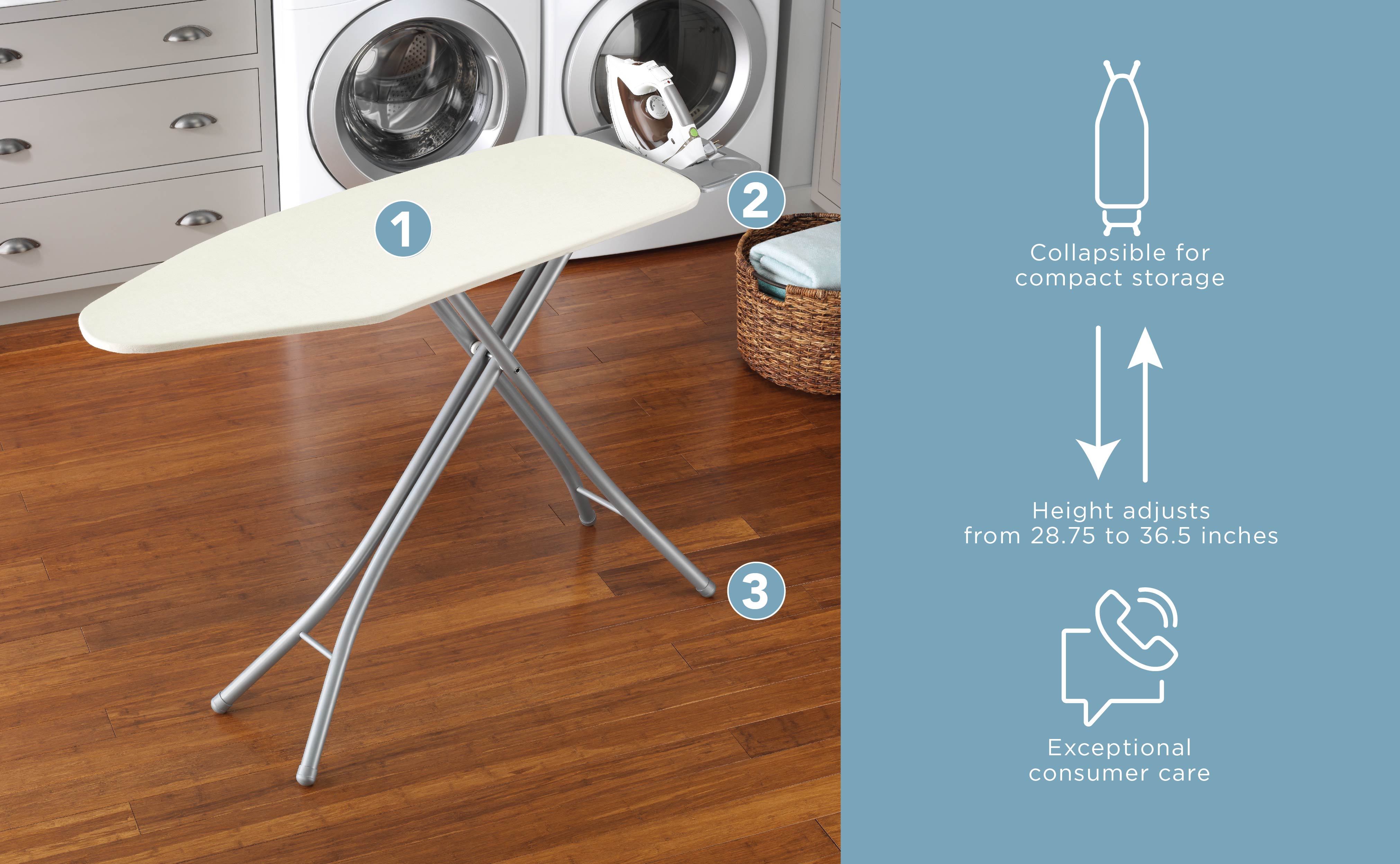 - لوح كي واسع مع سطح معدني قوي وإطار؛ تضمن أغطية الأرضية البلاستيكية سطحًا ثابتًا للكي