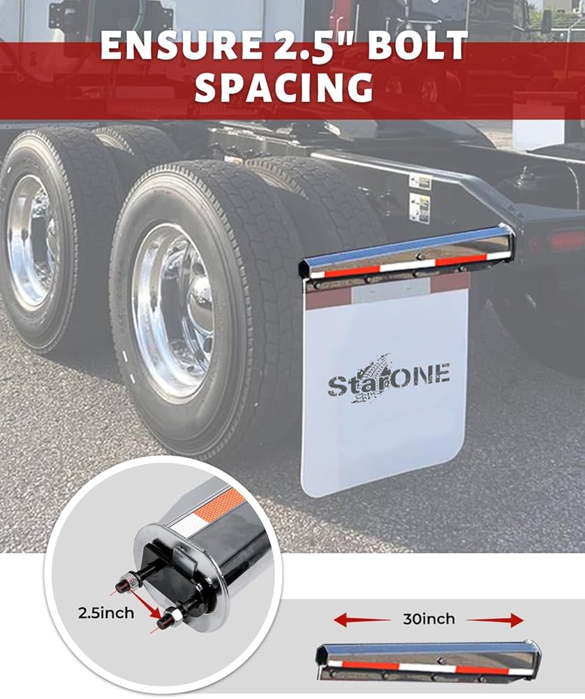أصبح تركيب شماعات Mudflap بمسامير أمرًا سهلاً: يتم تسهيل تجميع البراغي العمودية بواسطة الصواميل المضمنة؛ لا حاجة للقطع أو الحفر. ما عليك سوى التحقق من تباعد مركز الترباس الخاص بشاحنتك نصف بوصة بمقدار 2.5 بوصة قبل الشراء للحصول على تجربة إعداد سلسة وخالية من الأدوات.